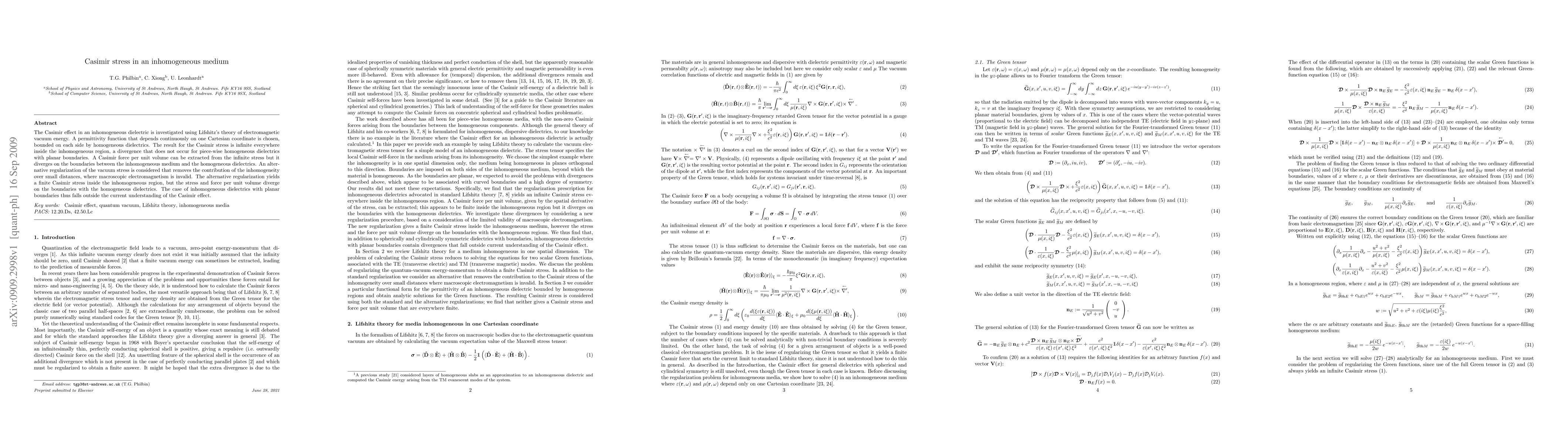This paper examines the Casimir effect in an inhomogeneous dielectric medium using Lifshitz theory, revealing infinite Casimir stress within the inhomogeneous region that diverges at the boundaries with homogeneous dielectrics. An alternative regularization method yields finite stress inside the inhomogeneity but still results in boundary divergences.