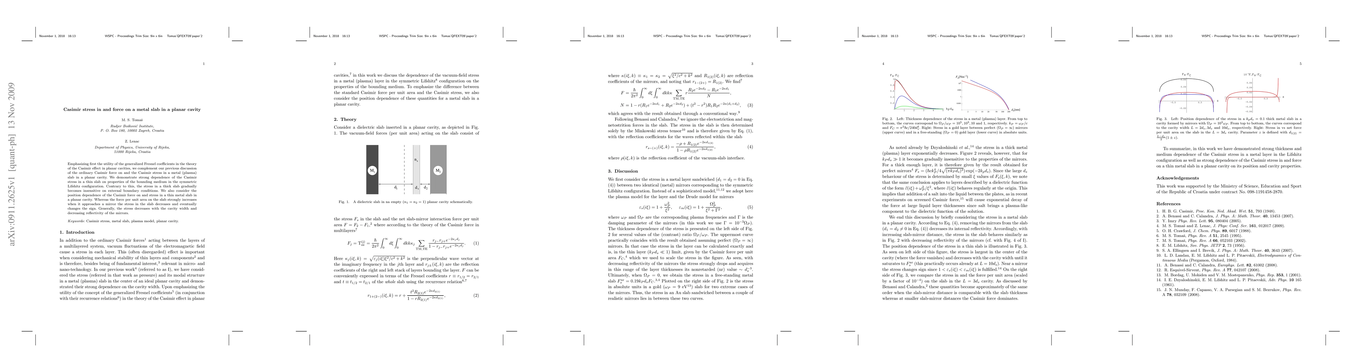 Theoretical model based on generalized Fresnel coefficients was used to calculate Casimir stress in a metal slab in a planar cavity.