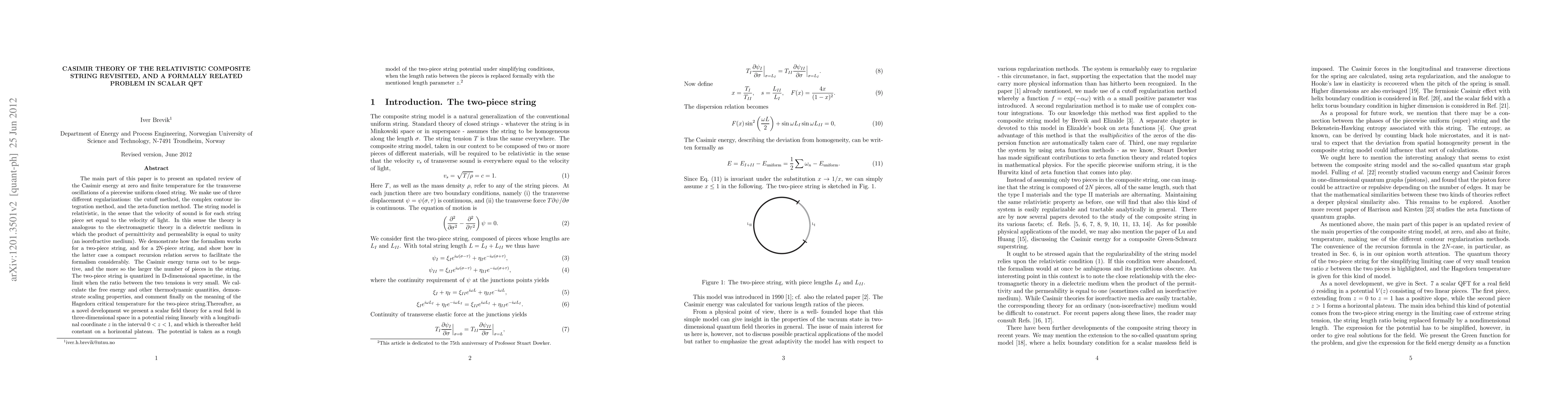 This paper updates the Casimir energy calculations for relativistic composite strings at zero and finite temperatures using three regularization methods. It introduces a compact recursion relation for 2N-piece strings, showing negative Casimir energy increasing with string pieces. The paper also explores a novel scalar field theory in 3D space with a potential rising linearly with z, as a simplified model of the two-piece string potential.