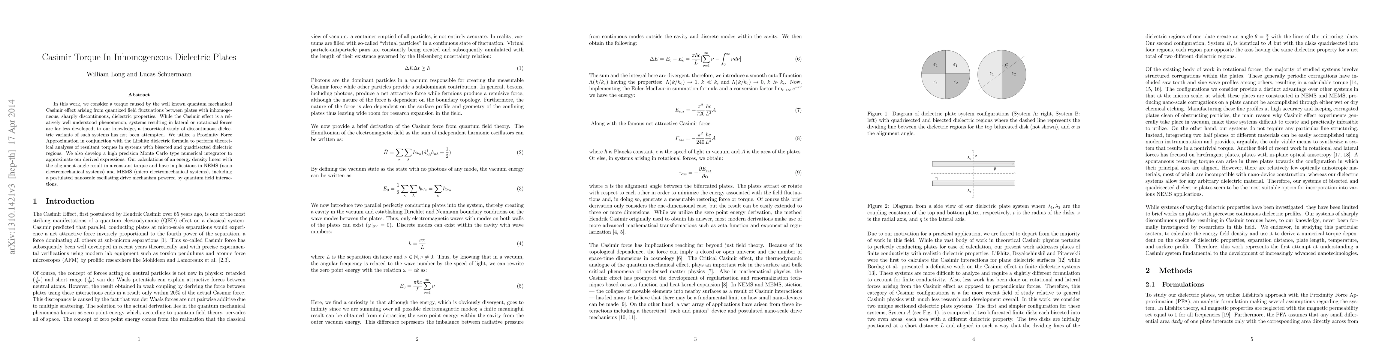 This paper investigates the Casimir torque generated by quantum mechanical Casimir effects between plates with inhomogeneous dielectric properties. Utilizing the Proximity Force Approximation and Lifshitz formula, the study analyzes torques in systems with sharply discontinuous dielectric regions and proposes a high-precision numerical integrator, revealing potential applications in NEMS and MEMS.