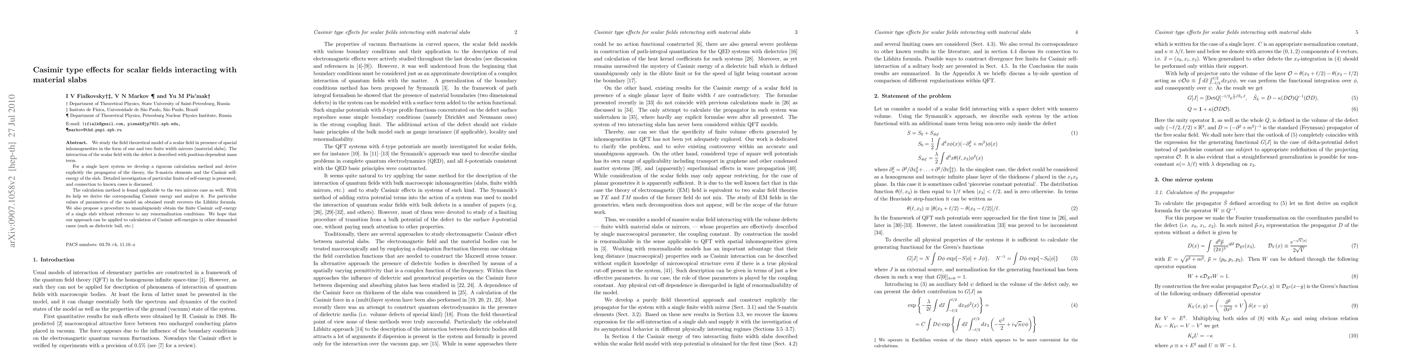 We study the field theoretical model of a scalar field in presence of spacial inhomogeneities in form of one and two finite width mirrors (material slabs). The interaction of the scalar field with the defect is described with position-dependent mass term. For the single layer system we develop a rigorous calculation method and derive explicitly the propagator of the theory, S-matrix elements and the Casimir self-energy of the slab. Detailed investigation of particular limits of self-energy is presented, and connection to know cases is discussed. The calculation method is found applicable to the two mirrors case as well. By means of it we derive the corresponding Casimir energy and analyze it. For particular values of the parameters of the model the obtained results recover the Lifshitz formula. We also propose a procedure to obtain unambiguously the finite Casimir \textit{self}-energy of a single slab without reference to any renormalizations. We hope that our approach can be applied to calculation of Casimir self-energies in other demanded cases (such as dielectric ball, etc.)