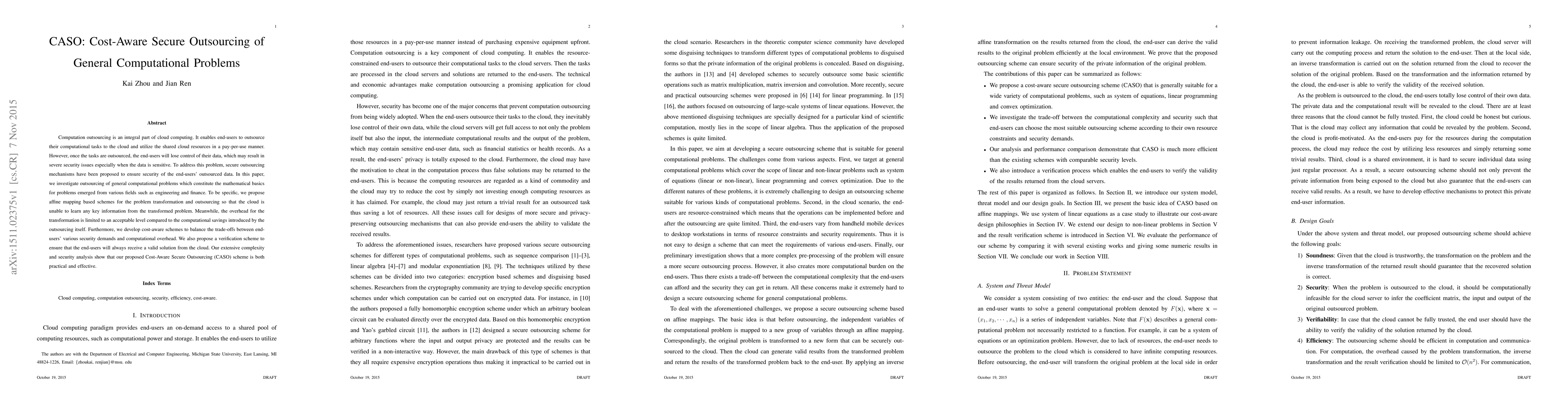 This paper proposes a Cost-Aware Secure Outsourcing (CASO) scheme to address security issues in computation outsourcing, ensuring that sensitive data remains secure while transforming and outsourcing general computational problems. The scheme balances security demands with computational overhead and includes a verification method to guarantee the validity of solutions received from the cloud.