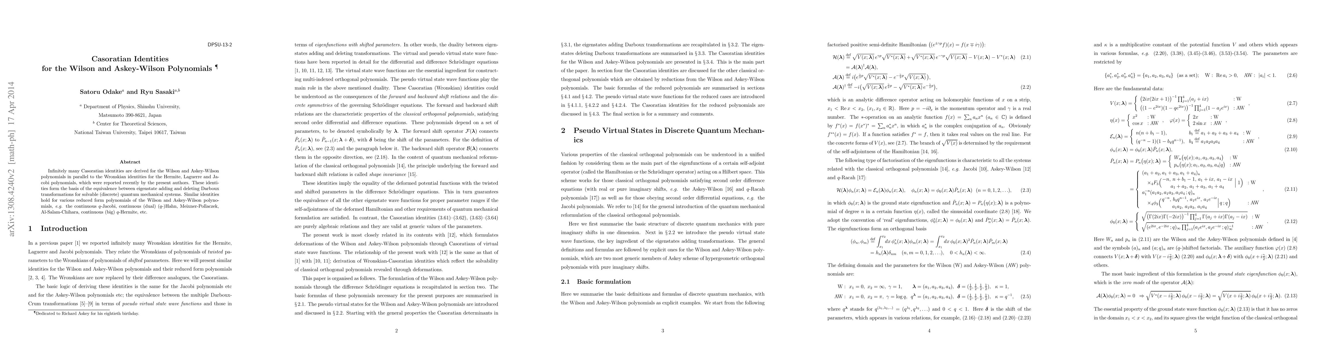 The research derives infinitely many Casoratian identities for the Wilson and Askey-Wilson polynomials, parallel to Wronskian identities for Hermite, Laguerre, and Jacobi polynomials, forming the basis for equivalence between eigenstate adding and deleting Darboux transformations in solvable (discrete) quantum mechanical systems.