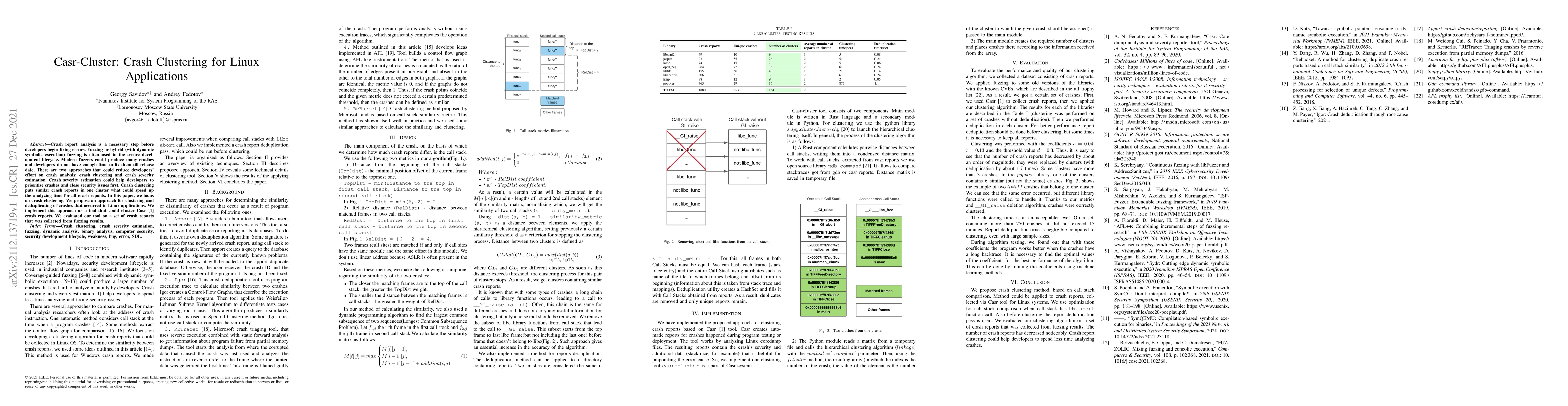 This paper proposes a method for clustering and deduplicating crash reports in Linux applications to expedite the analysis process. The tool, Casr-Cluster, groups similar crashes, which helps developers prioritize and address critical issues more efficiently.