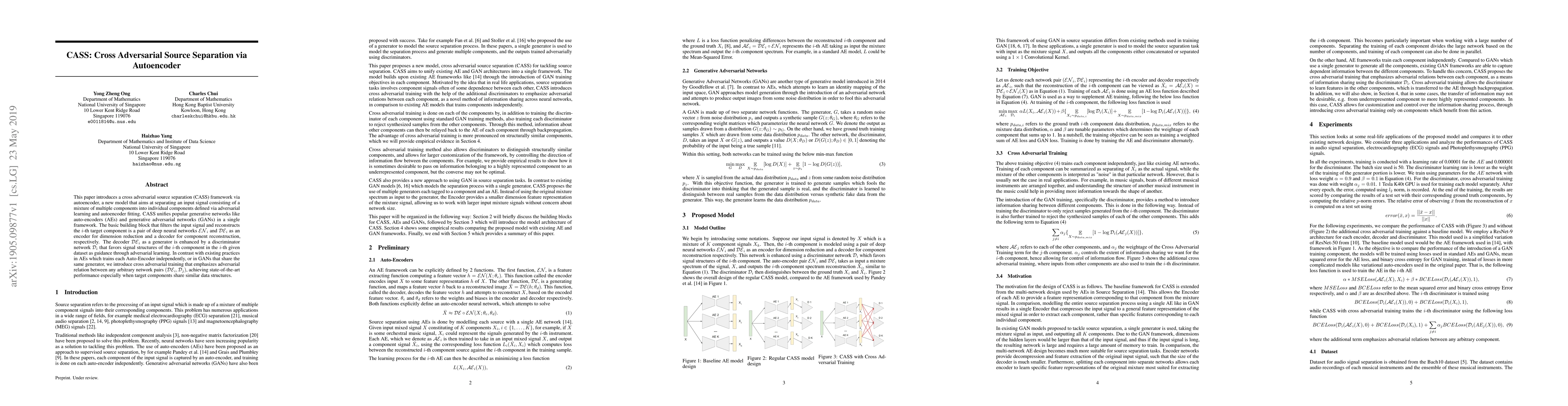 This paper proposes CASS, a cross adversarial source separation framework using autoencoders and GANs to separate mixed signals into individual components. It employs adversarial training between decoders and discriminators to achieve state-of-the-art performance, especially for components with similar data structures.