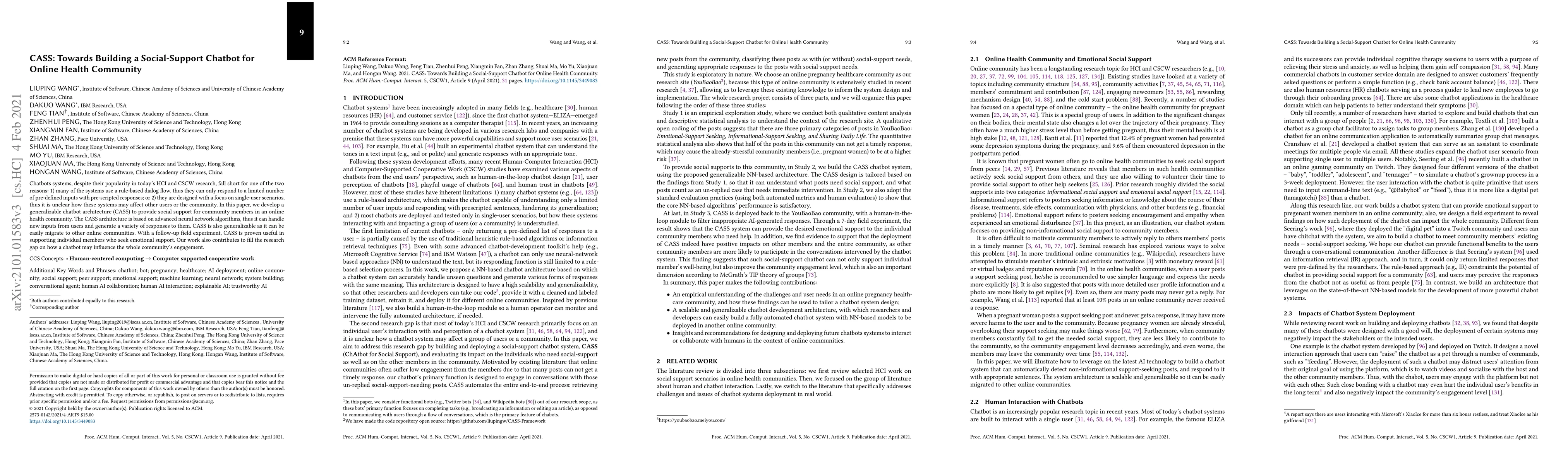 This paper introduces CASS, a chatbot architecture based on advanced neural networks to provide social support in online health communities. CASS is designed to handle new inputs and generate diverse responses, addressing the limitations of rule-based systems and single-user scenarios, and is shown to enhance individual and community engagement through field experiments.