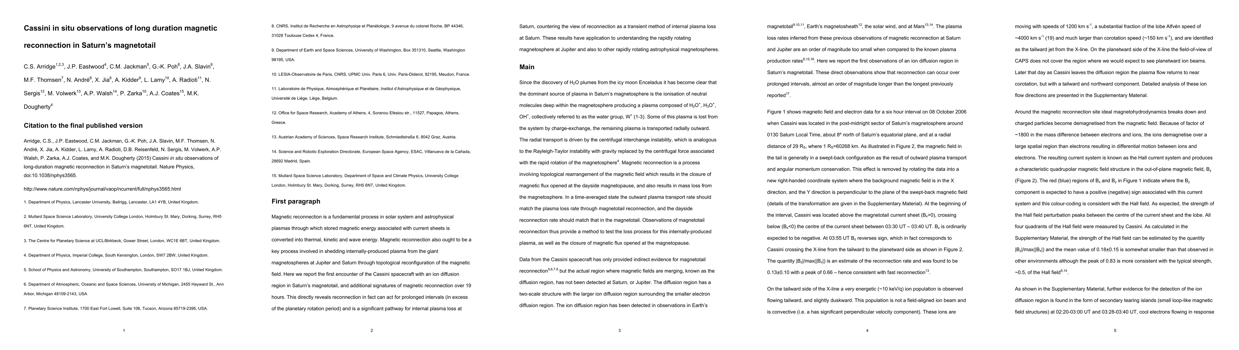 Cassini spacecraft observed long-duration magnetic reconnection in Saturn's magnetotail over 19 hours, challenging the notion of reconnection as a transient process. This sustained reconnection suggests it is a significant pathway for internal plasma loss in Saturn's magnetosphere, with implications for understanding similar processes in Jupiter and other rapidly rotating magnetospheres.