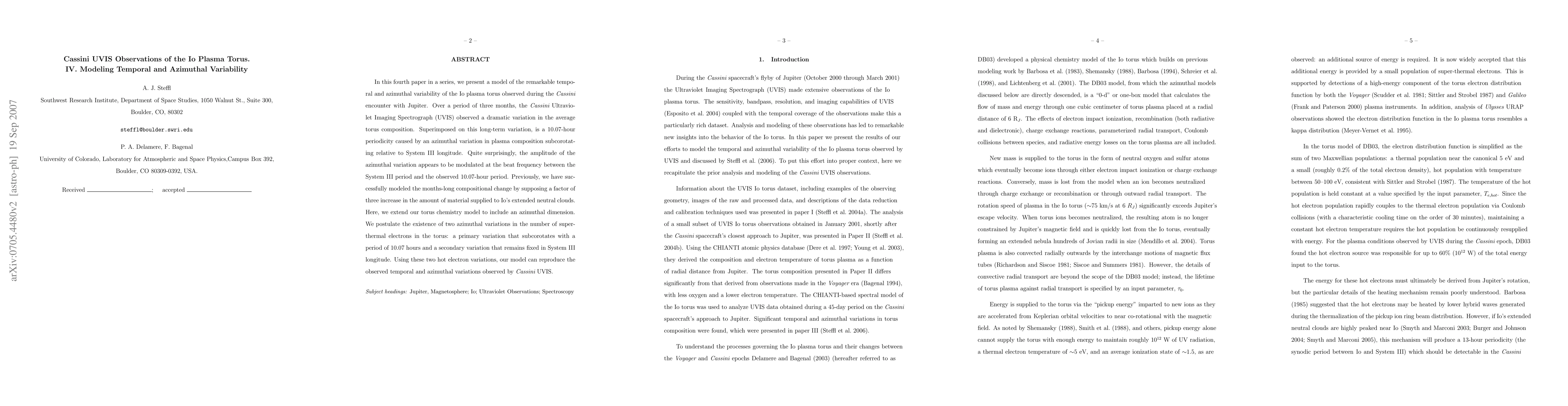 This paper models the temporal and azimuthal variability in the Io plasma torus observed by Cassini's UVIS, revealing a 10.07-hour periodicity and a modulation at the beat frequency between the System III period and the observed period. The model includes two variations in super-thermal electrons to reproduce the observed variations.