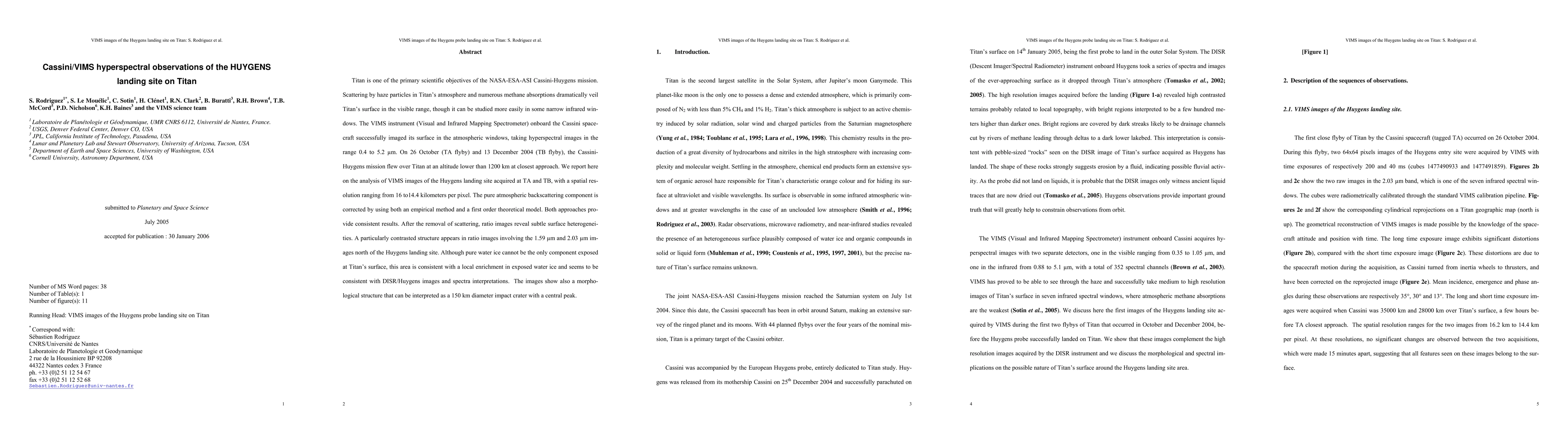 This paper analyzes hyperspectral images from the Cassini/VIMS instrument of Titan's Huygens landing site, revealing surface heterogeneities and a possible 150 km diameter impact crater with a central peak. The study corrects atmospheric scattering to identify a local enrichment in exposed water ice north of the landing site.