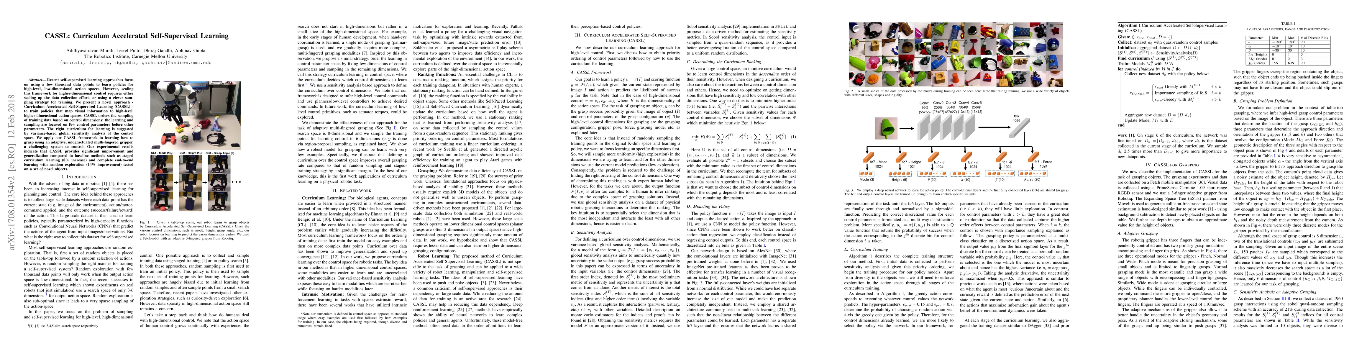 Recent self-supervised learning approaches focus on using a few thousand data points to learn policies for high-level, low-dimensional action spaces. However, scaling this framework for high-dimensional control require either scaling up the data collection efforts or using a clever sampling strategy for training. We present a novel approach - Curriculum Accelerated Self-Supervised Learning (CASSL) - to train policies that map visual information to high-level, higher- dimensional action spaces. CASSL orders the sampling of training data based on control dimensions: the learning and sampling are focused on few control parameters before other parameters. The right curriculum for learning is suggested by variance-based global sensitivity analysis of the control space. We apply our CASSL framework to learning how to grasp using an adaptive, underactuated multi-fingered gripper, a challenging system to control. Our experimental results indicate that CASSL provides significant improvement and generalization compared to baseline methods such as staged curriculum learning (8% increase) and complete end-to-end learning with random exploration (14% improvement) tested on a set of novel objects.