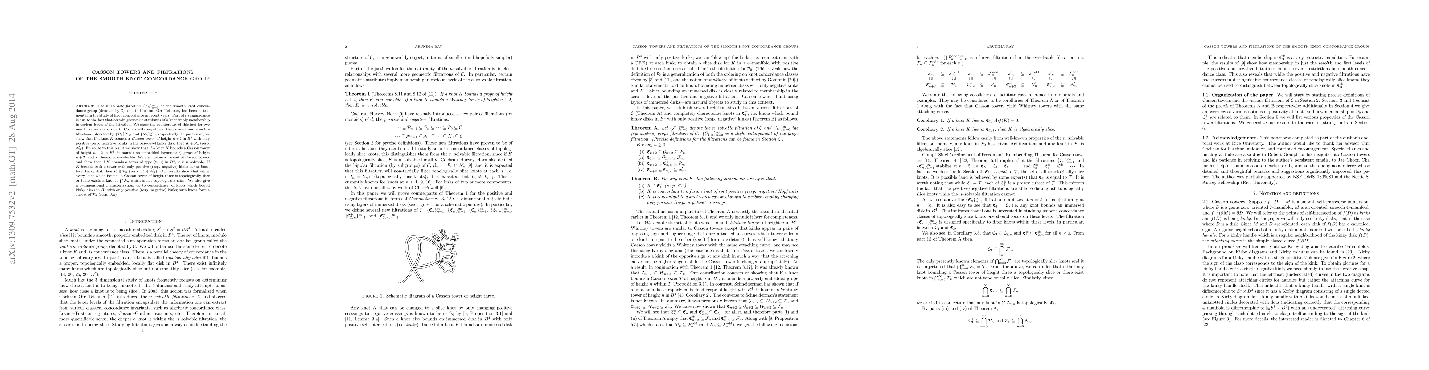 The n-solvable filtration $\{\mathcal{F}_n\}_{n=0}^\infty$ of the smooth knot concordance group (denoted by $\mathcal{C}$), due to Cochran-Orr-Teichner, has been instrumental in the study of knot concordance in recent years. Part of its significance is due to the fact that certain geometric characterizations of a knot imply membership in various levels of the filtration. We show the counterpart of this fact for two new filtrations of $\mathcal{C}$ due to Cochran-Harvey-Horn, the positive and negative filtrations, denoted by $\{\mathcal{P}_n\}_{n=0}^\infty$ and $\{\mathcal{N}_n\}_{n=0}^\infty$ respectively. In particular, we show that if a knot K bounds a Casson tower of height n+2 in the 4-ball with only positive (resp. negative) kinks in the base-level kinky disk, then K is in $\mathcal{P}_n$ (resp. $\mathcal{N}_n$). En route to this result we show that if a knot K bounds a Casson tower of height n+2 in the 4-ball, it bounds an embedded (symmetric) grope of height n+2, and is therefore, n-solvable (this also implies that topologically slice knots bound arbitrarily tall gropes in the 4-ball). We also define a variant of Casson towers and show that if K bounds a tower of type (2,n) in the 4-ball, it is n-solvable. If K bounds such a tower with only positive (resp. negative) kinks in the base-level kinky disk then K is in $\mathcal{P}_n$ (resp. $\mathcal{N}_n$). Our results show that either every knot which bounds a Casson tower of height three is topologically slice or there exists a knot which is not topologically slice but lies in each $\mathcal{F}_n$. We also give a 3-dimensional characterization, up to concordance, of knots which bound kinky disks in the 4-ball with only positive (resp. negative) kinks; such knots form a subset of $\mathcal{P}_0$ (resp. $\mathcal{N}_0$).
