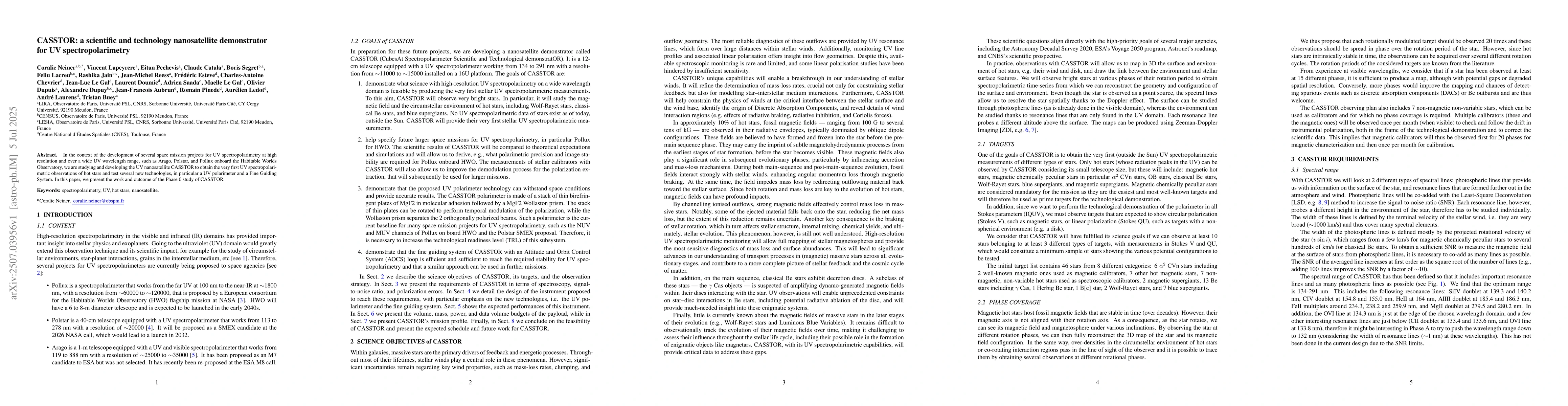 In the context of the development of several space mission projects for UV spectropolarimetry at high resolution and over a wide UV wavelength range, such as Arago, Polstar, and Pollux onboard the Habitable Worlds Observatory, we are studying and developing the UV nanosatellite CASSTOR to obtain the very first UV spectropolarimetric observations of hot stars and test several new technologies, in particular a UV polarimeter and a Fine Guiding System. In this paper, we present the work and outcome of the Phase 0 study of CASSTOR.