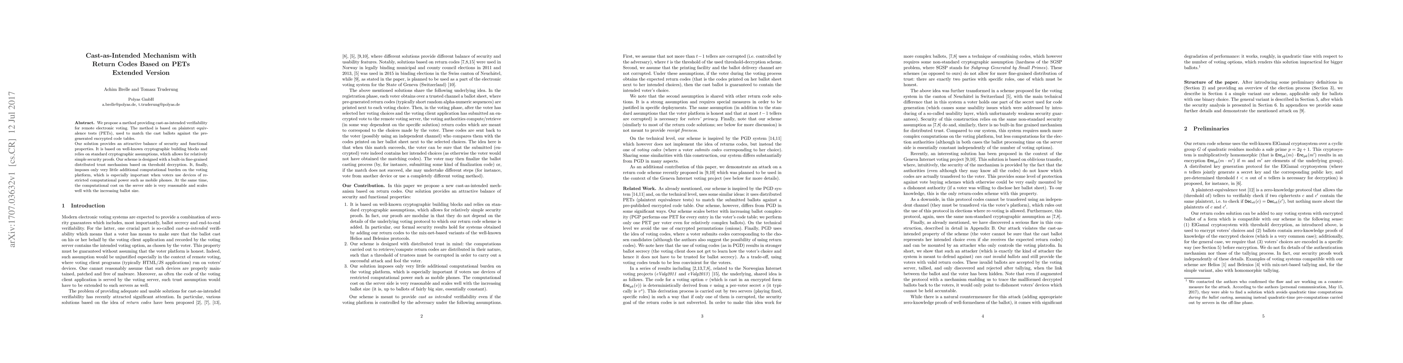 We propose a method providing cast-as-intended verifiability for remote electronic voting. The method is based on plaintext equivalence tests (PETs), used to match the cast ballots against the pre-generated encrypted code tables. Our solution provides an attractive balance of security and functional properties. It is based on well-known cryptographic building blocks and relies on standard cryptographic assumptions, which allows for relatively simple security analysis. Our scheme is designed with a built-in fine-grained distributed trust mechanism based on threshold decryption. It, finally, imposes only very little additional computational burden on the voting platform, which is especially important when voters use devices of restricted computational power such as mobile phones. At the same time, the computational cost on the server side is very reasonable and scales well with the increasing ballot size.
