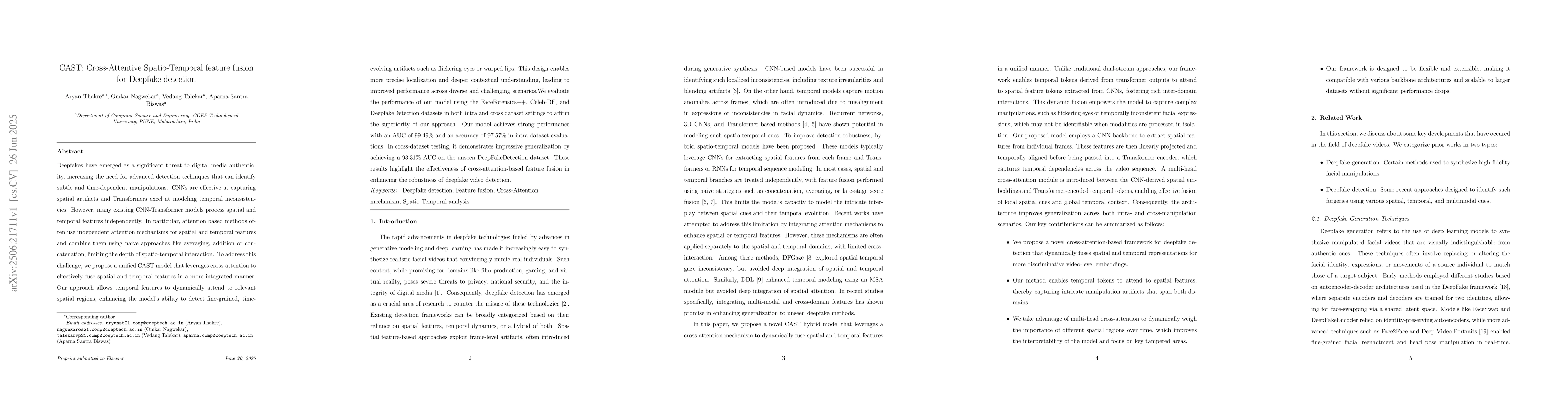 Deepfakes have emerged as a significant threat to digital media authenticity, increasing the need for advanced detection techniques that can identify subtle and time-dependent manipulations. CNNs are effective at capturing spatial artifacts, and Transformers excel at modeling temporal inconsistencies. However, many existing CNN-Transformer models process spatial and temporal features independently. In particular, attention-based methods often use separate attention mechanisms for spatial and temporal features and combine them using naive approaches like averaging, addition, or concatenation, which limits the depth of spatio-temporal interaction. To address this challenge, we propose a unified CAST model that leverages cross-attention to effectively fuse spatial and temporal features in a more integrated manner. Our approach allows temporal features to dynamically attend to relevant spatial regions, enhancing the model's ability to detect fine-grained, time-evolving artifacts such as flickering eyes or warped lips. This design enables more precise localization and deeper contextual understanding, leading to improved performance across diverse and challenging scenarios. We evaluate the performance of our model using the FaceForensics++, Celeb-DF, and DeepfakeDetection datasets in both intra- and cross-dataset settings to affirm the superiority of our approach. Our model achieves strong performance with an AUC of 99.49 percent and an accuracy of 97.57 percent in intra-dataset evaluations. In cross-dataset testing, it demonstrates impressive generalization by achieving a 93.31 percent AUC on the unseen DeepfakeDetection dataset. These results highlight the effectiveness of cross-attention-based feature fusion in enhancing the robustness of deepfake video detection.