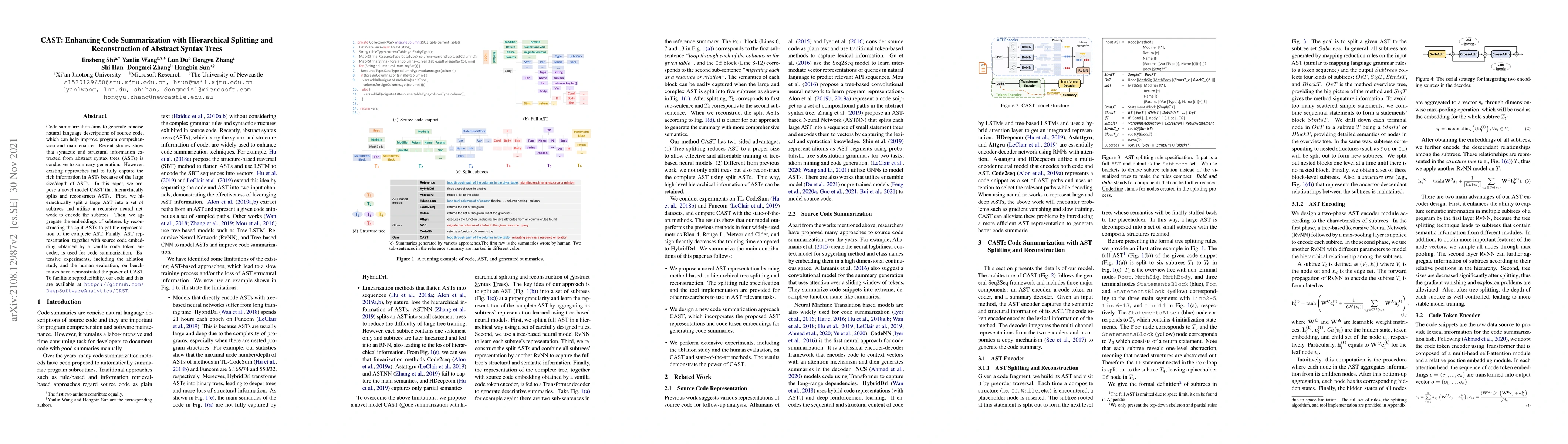 This paper introduces CAST, a novel model that enhances code summarization by hierarchically splitting and reconstructing abstract syntax trees (ASTs) to better capture their rich information. The model uses recursive neural networks to encode split subtrees and reconstructs them to aggregate embeddings, ultimately aiding in generating concise natural language descriptions of source code. Experiments show CAST's effectiveness.