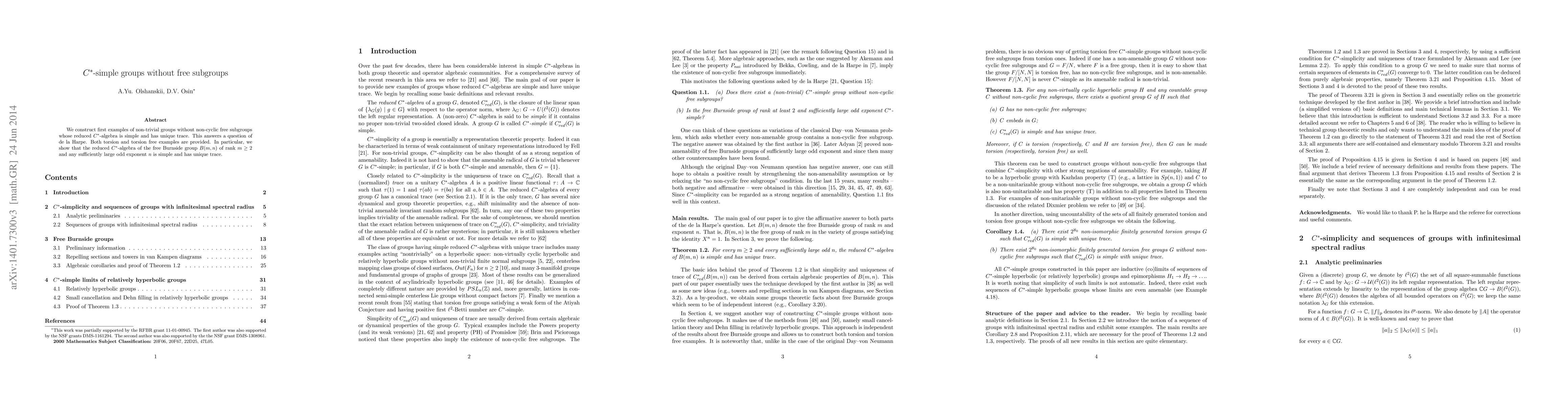 Researchers create examples of groups without free subgroups whose reduced $C^ ext{*}$-algebra is simple and has unique trace, answering a question of de la Harpe.