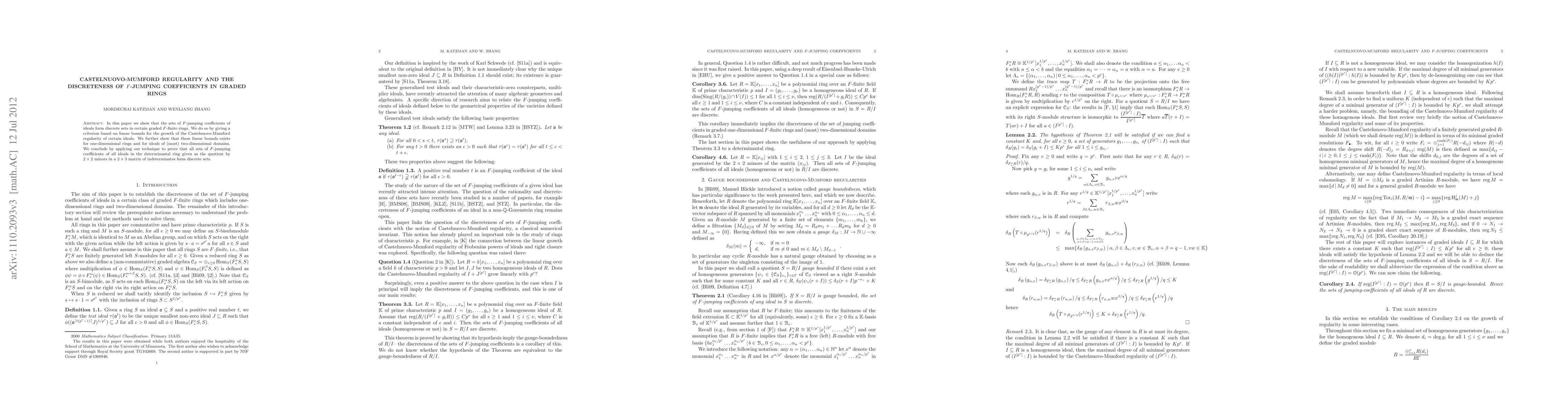 Summary: This paper establishes that $F$-jumping coefficients of ideals in certain graded $F$-finite rings are discrete, demonstrated through a criterion based on linear bounds for Castelnuovo-Mumford regularity. It applies these findings to show discreteness in one-dimensional rings and specific two-dimensional domains, and proves the discreteness of such sets in determinantal rings from $2\times 3$ matrix minors.