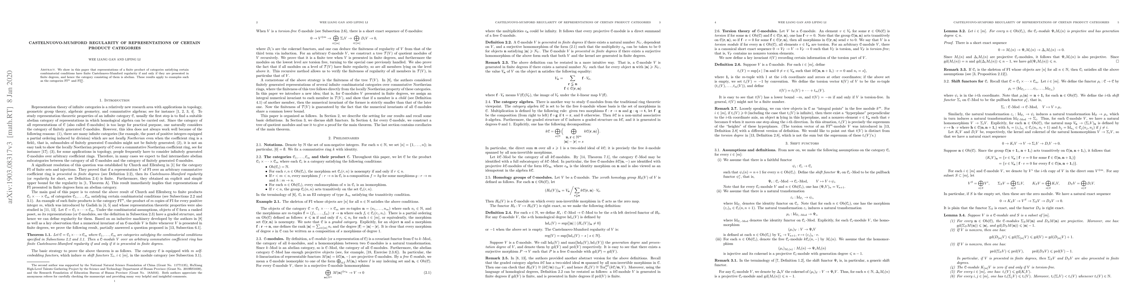 Representations of finite product categories with specific combinatorial conditions have finite Castelnuovo-Mumford regularity if they can be presented in finite degrees, leading to an abelian category.