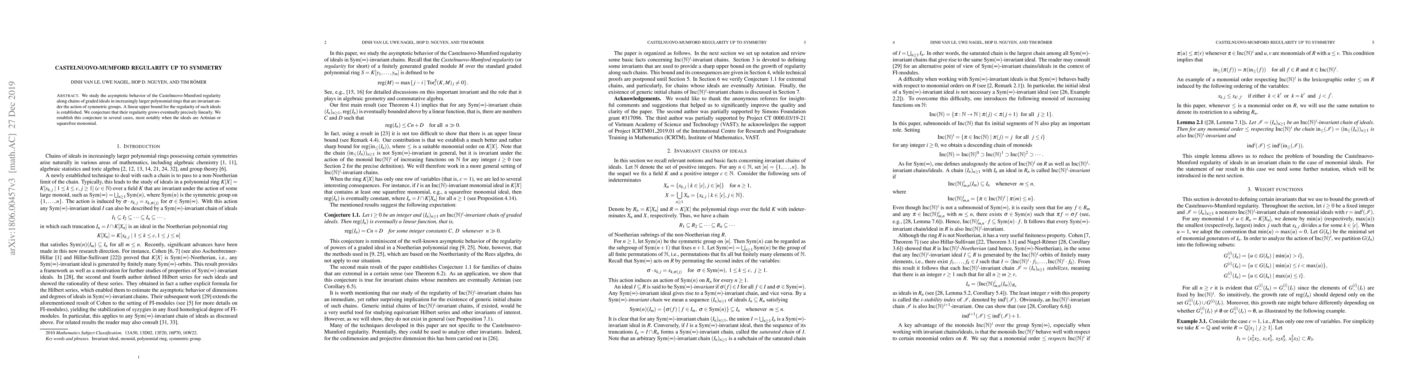 This paper investigates the asymptotic behavior of Castelnuovo-Mumford regularity along chains of graded ideals invariant under symmetric groups, establishing a linear upper bound for the regularity and proving this conjecture for Artinian and squarefree monomial ideals.