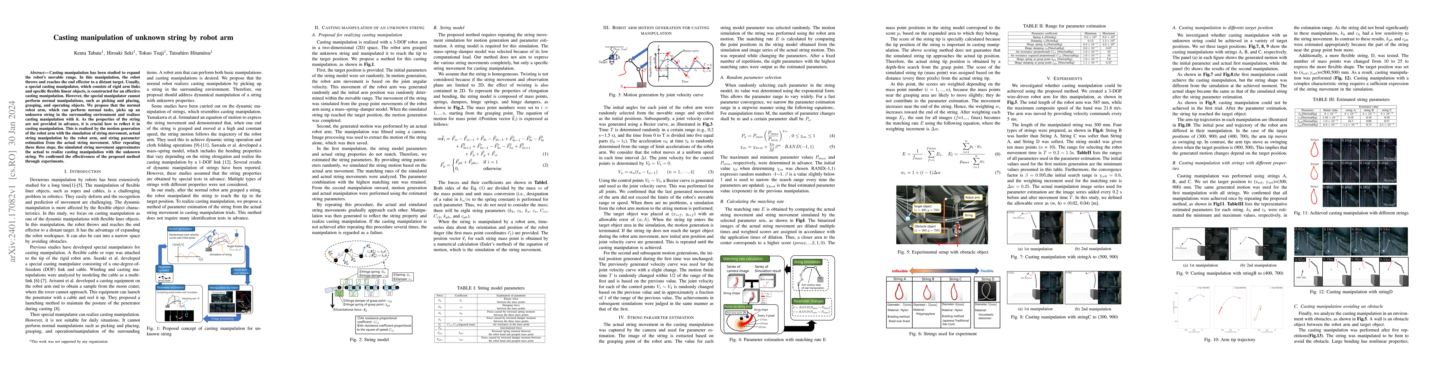 This paper proposes a method for a standard robot arm to perform casting manipulation using an unknown string found in the environment, involving simulation, actual manipulation, and parameter estimation to approximate real string movement. Experiments confirm the method's effectiveness, potentially enhancing the capabilities of various service robots.