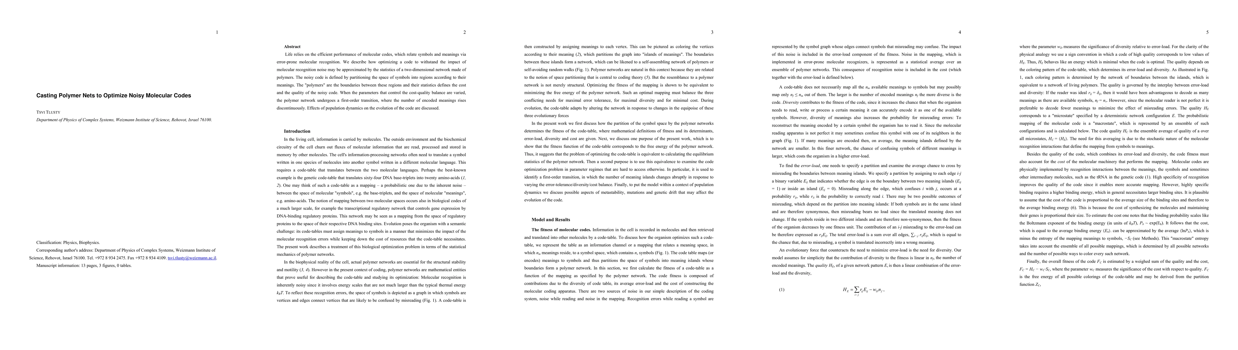 Life relies on the efficient performance of molecular codes, which relate symbols and meanings via error-prone molecular recognition. We describe how optimizing a code to withstand the impact of molecular recognition noise may be approximated by the statistics of a two-dimensional network made of polymers. The noisy code is defined by partitioning the space of symbols into regions according to their meanings. The "polymers" are the boundaries between these regions and their statistics defines the cost and the quality of the noisy code. When the parameters that control the cost-quality balance are varied, the polymer network undergoes a first-order transition, where the number of encoded meanings rises discontinuously. Effects of population dynamics on the evolution of molecular codes are discussed.