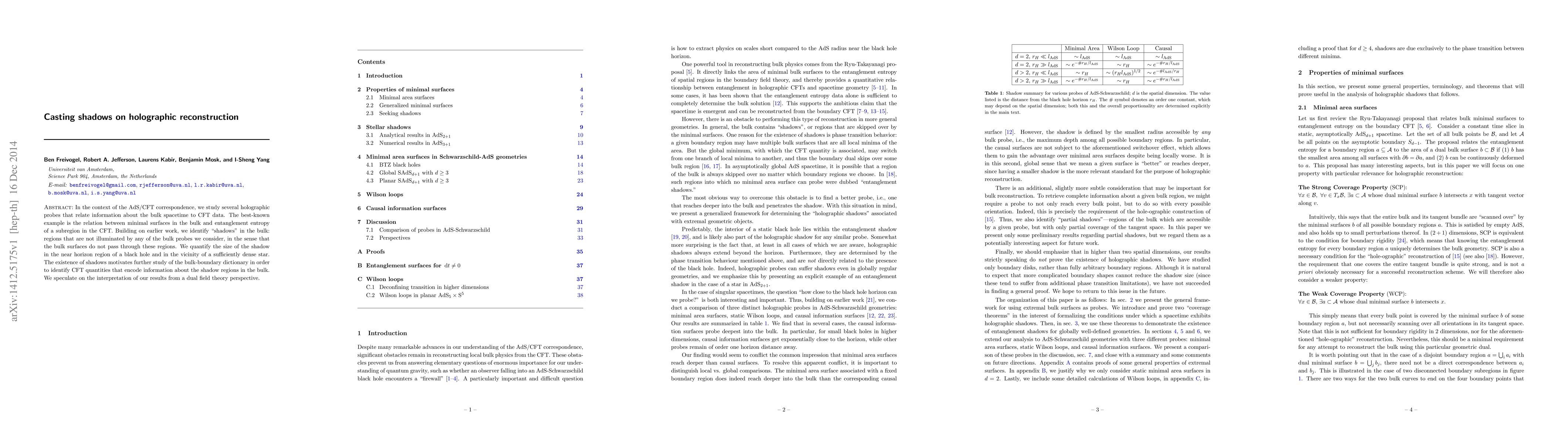In the context of the AdS/CFT correspondence, we study several holographic probes that relate information about the bulk spacetime to CFT data. The best-known example is the relation between minimal surfaces in the bulk and entanglement entropy of a subregion in the CFT. Building on earlier work, we identify "shadows" in the bulk: regions that are not illuminated by any of the bulk probes we consider, in the sense that the bulk surfaces do not pass through these regions. We quantify the size of the shadow in the near horizon region of a black hole and in the vicinity of a sufficiently dense star. The existence of shadows motivates further study of the bulk-boundary dictionary in order to identify CFT quantities that encode information about the shadow regions in the bulk. We speculate on the interpretation of our results from a dual field theory perspective.