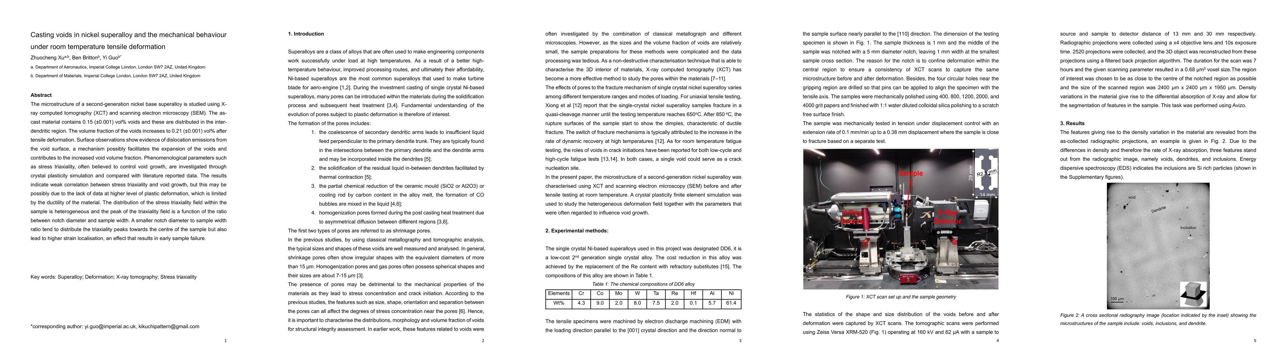 This study investigates the microstructure and mechanical behaviour of a second-generation nickel superalloy under tensile deformation, revealing an increase in void volume fraction from 0.15% to 0.21% post-deformation. Dislocation emissions from voids suggest a mechanism for void expansion, while simulations show a weak correlation between stress triaxiality and void growth.