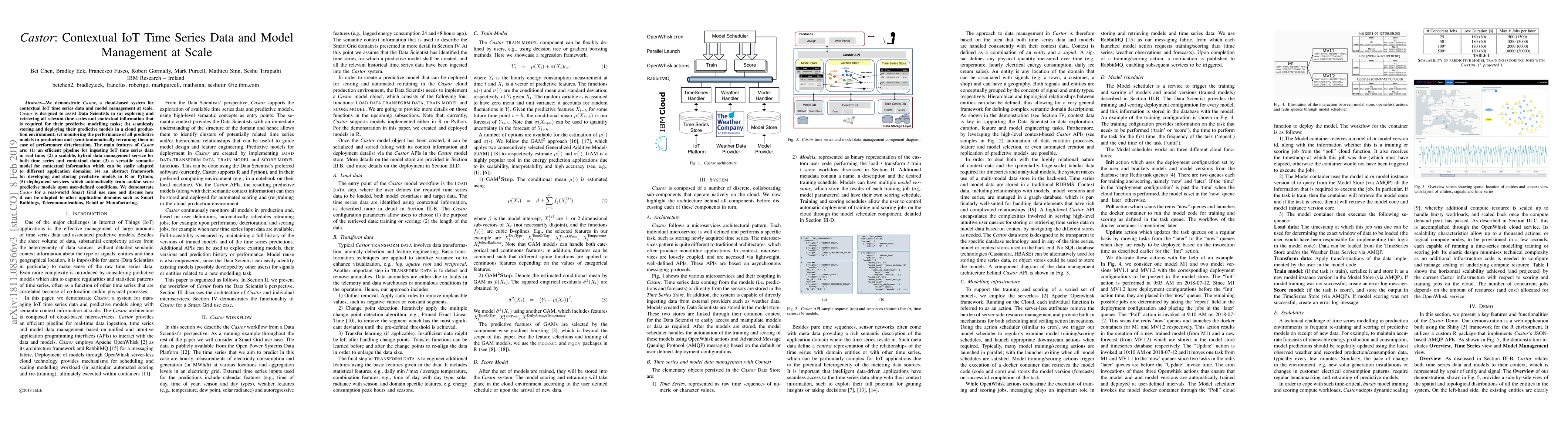 Castor is a cloud-based system designed for managing IoT time series data and predictive models at scale, featuring real-time data ingestion, scalable data management, and automatic model retraining. It supports data scientists in model deployment and performance monitoring across various domains.