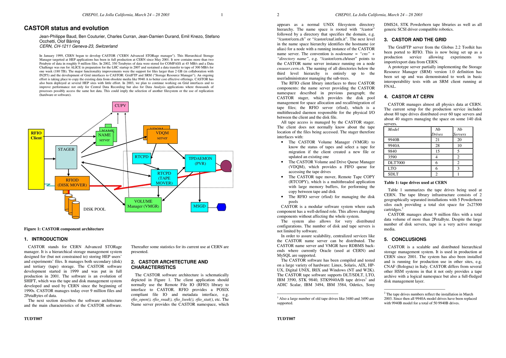 In January 1999, CERN began to develop CASTOR ("CERN Advanced STORage manager"). This Hierarchical Storage Manager targetted at HEP applications has been in full production at CERN since May 2001. It now contains more than two Petabyte of data in roughly 9 million files. In 2002, 350 Terabytes of data were stored for COMPASS at 45 MB/s and a Data Challenge was run for ALICE in preparation for the LHC startup in 2007 and sustained a data transfer to tape of 300 MB/s for one week (180 TB). The major functionality improvements were the support for files larger than 2 GB (in collaboration with IN2P3) and the development of Grid interfaces to CASTOR: GridFTP and SRM ("Storage Resource Manager"). An ongoing effort is taking place to copy the existing data from obsolete media like 9940 A to better cost effective offerings. CASTOR has also been deployed at several HEP sites with little effort. In 2003, we plan to continue working on Grid interfaces and to improve performance not only for Central Data Recording but also for Data Analysis applications where thousands of processes possibly access the same hot data. This could imply the selection of another filesystem or the use of replication (hardware or software).