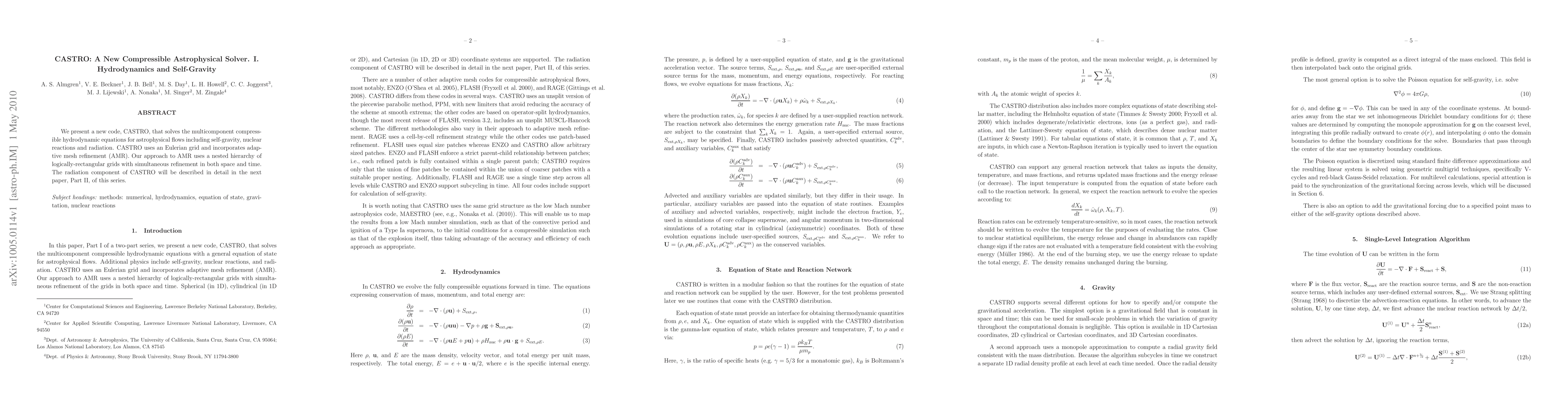 CASTRO is a new astrophysical solver that addresses multicomponent compressible hydrodynamics and self-gravity using an Eulerian grid with adaptive mesh refinement (AMR). The AMR employs a nested hierarchy of logically-rectangular grids for simultaneous spatial and temporal refinement.