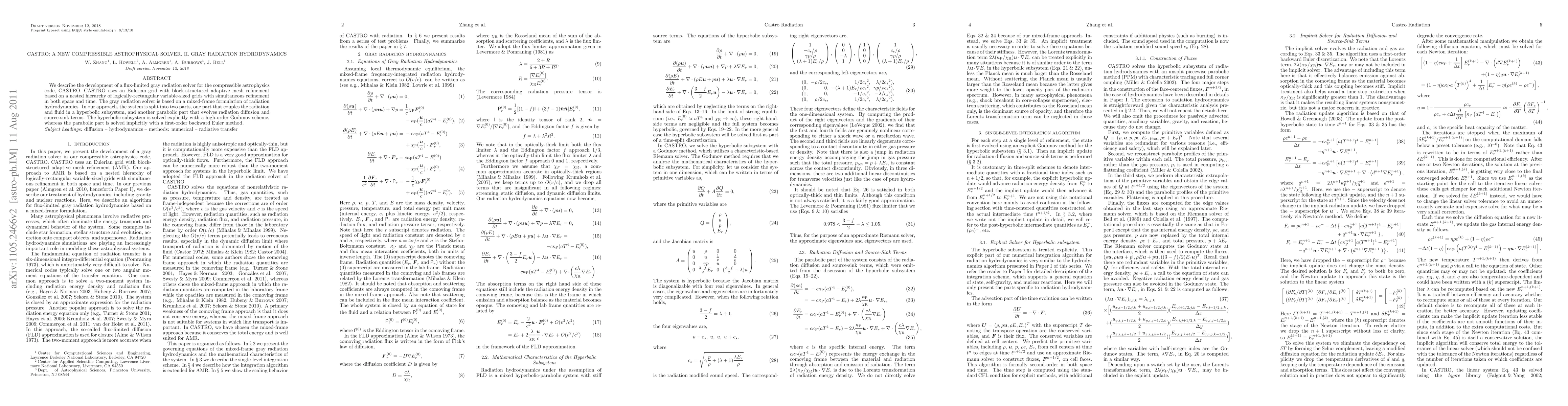 We describe the development of a flux-limited gray radiation solver for the compressible astrophysics code, CASTRO. CASTRO uses an Eulerian grid with block-structured adaptive mesh refinement based on a nested hierarchy of logically-rectangular variable-sized grids with simultaneous refinement in both space and time. The gray radiation solver is based on a mixed-frame formulation of radiation hydrodynamics. In our approach, the system is split into two parts, one part that couples the radiation and fluid in a hyperbolic subsystem, and another parabolic part that evolves radiation diffusion and source-sink terms. The hyperbolic subsystem is solved explicitly with a high-order Godunov scheme, whereas the parabolic part is solved implicitly with a first-order backward Euler method.