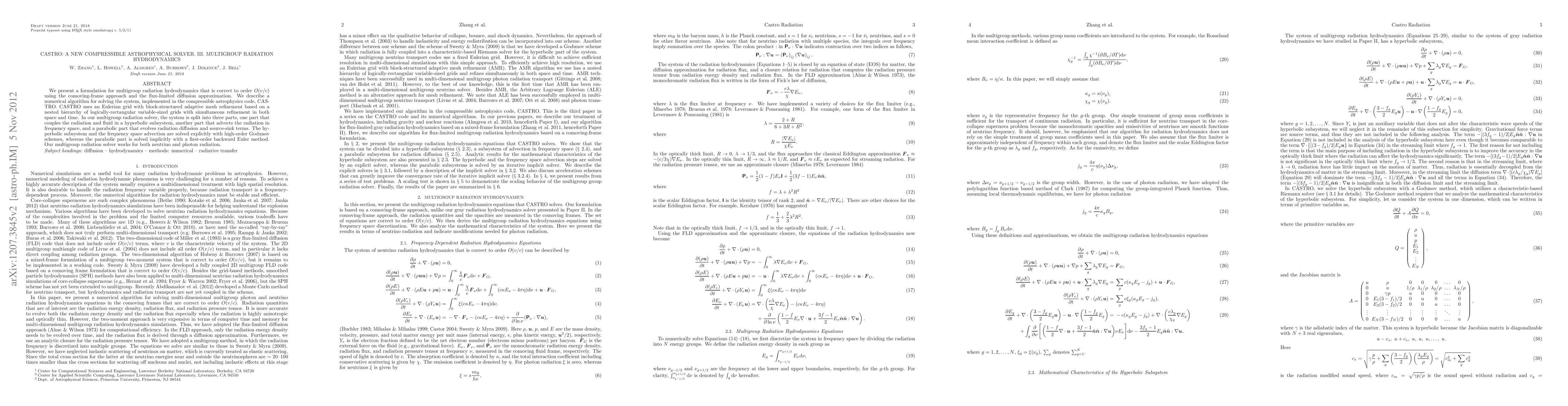 This paper introduces a new multigroup radiation hydrodynamics formulation in the CASTRO astrophysical solver, accurate to $O(v/c)$, employing the flux-limited diffusion approximation. The algorithm uses adaptive mesh refinement and solves the radiation-fluid coupling, advection, and diffusion implicitly and explicitly with high-order Godunov schemes.