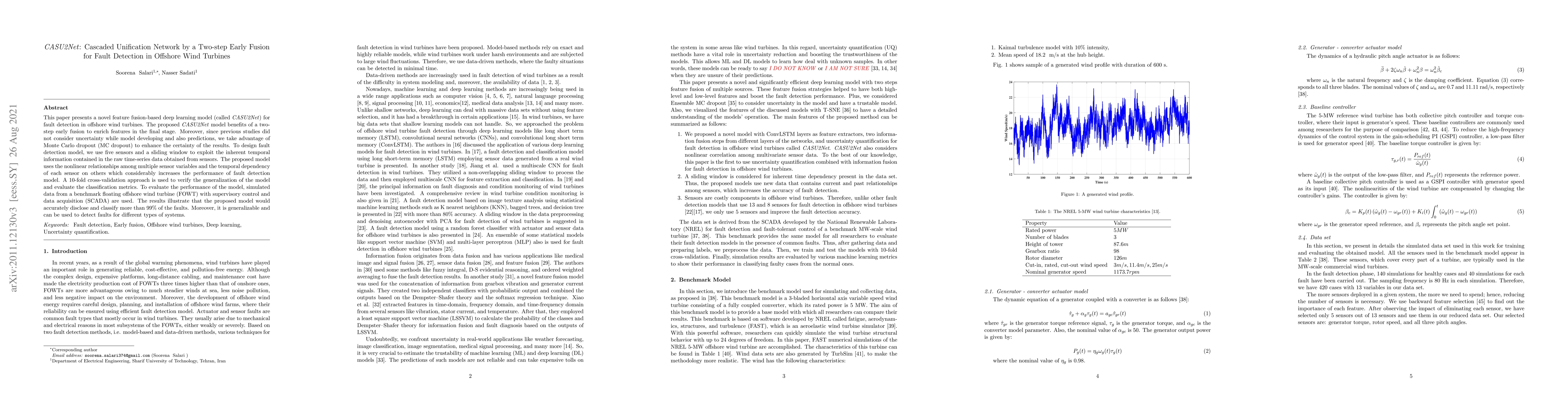 This paper presents a novel feature fusion-based deep learning model (called CASU2Net) for fault detection in offshore wind turbines. The proposed CASU2Net model benefits of a two-step early fusion to enrich features in the final stage. Moreover, since previous studies did not consider uncertainty while model developing and also predictions, we take advantage of Monte Carlo dropout (MC dropout) to enhance the certainty of the results. To design fault detection model, we use five sensors and a sliding window to exploit the inherent temporal information contained in the raw time-series data obtained from sensors. The proposed model uses the nonlinear relationships among multiple sensor variables and the temporal dependency of each sensor on others which considerably increases the performance of fault detection model. A 10-fold cross-validation approach is used to verify the generalization of the model and evaluate the classification metrics. To evaluate the performance of the model, simulated data from a benchmark floating offshore wind turbine (FOWT) with supervisory control and data acquisition (SCADA) are used. The results illustrate that the proposed model would accurately disclose and classify more than 99% of the faults. Moreover, it is generalizable and can be used to detect faults for different types of systems.