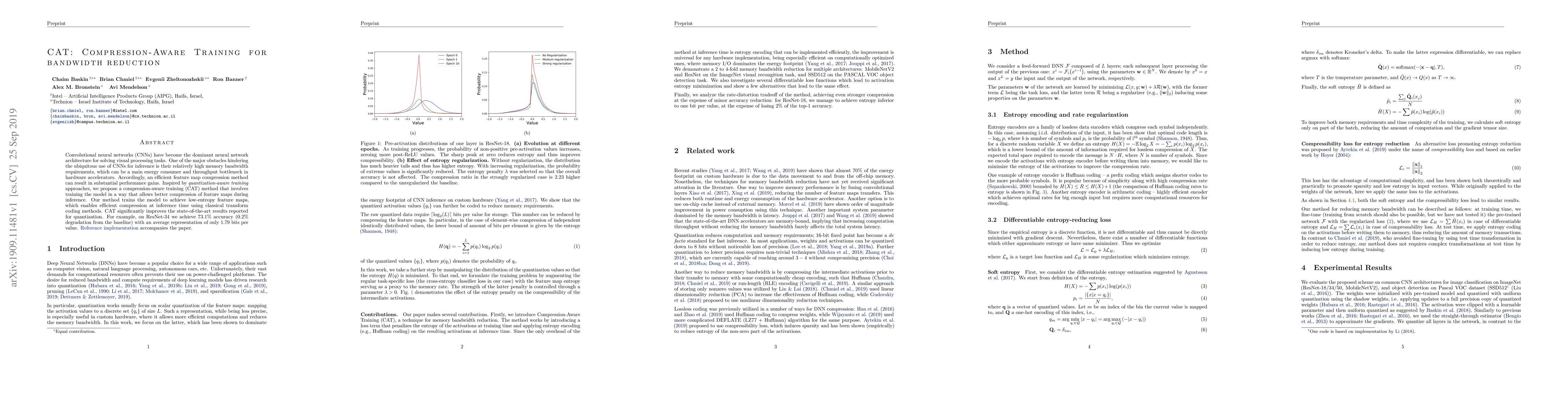 The paper proposes Compression-Aware Training (CAT) to reduce memory bandwidth requirements for CNNs by training models to produce low-entropy feature maps, enabling efficient compression during inference. CAT achieves state-of-the-art results in quantization, demonstrating 73.1% accuracy on ResNet-34 with only 1.79 bits per value.