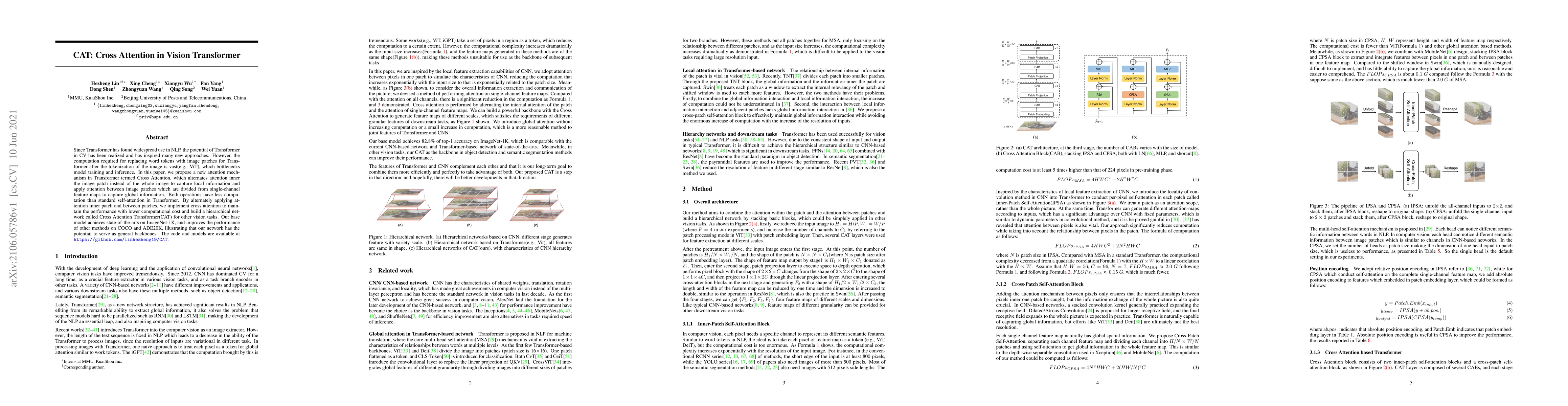 This paper introduces Cross Attention in Vision Transformer (CAT), a novel attention mechanism that reduces computational costs by alternating local attention within image patches and global attention between patches. The proposed hierarchical Cross Attention Transformer achieves state-of-the-art performance on ImageNet-1K and enhances results on COCO and ADE20K datasets.