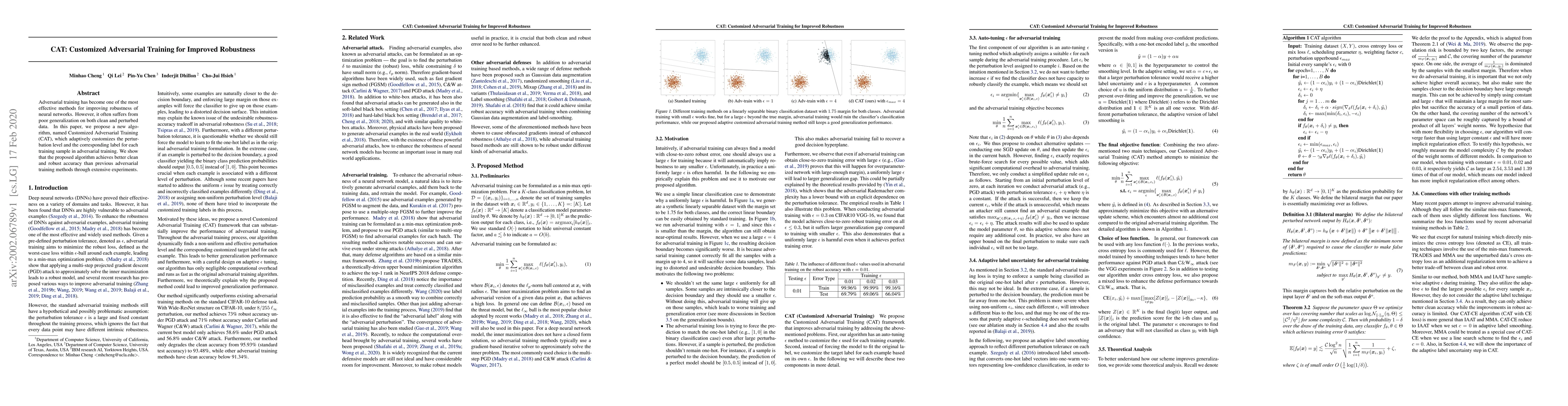 Title: CAT: Customized Adversarial Training for Improved Robustness Summary: This paper proposes Customized Adversarial Training (CAT) to adaptively tailor perturbation levels and labels for each training sample, achieving superior clean and robust accuracy compared to traditional adversarial training methods.