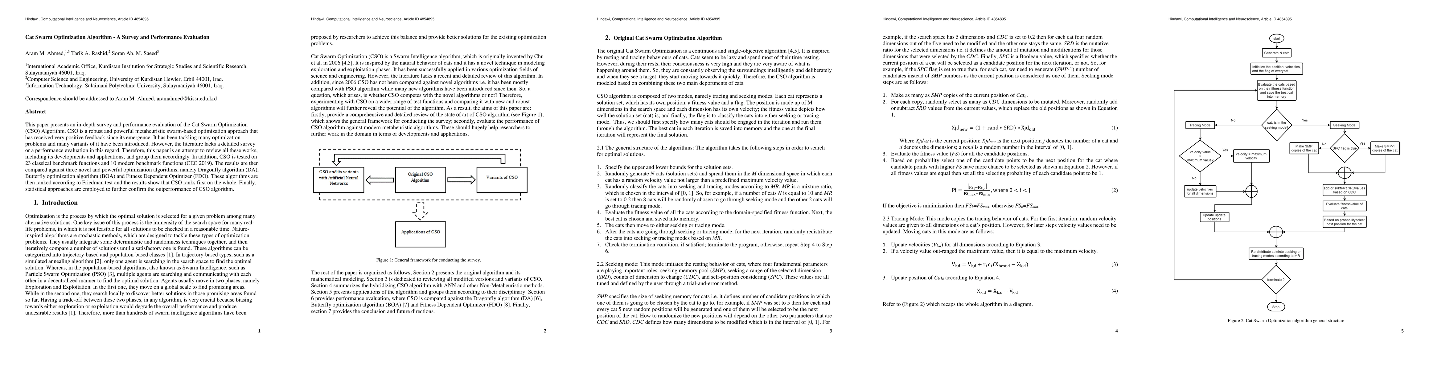 This paper surveys and evaluates the Cat Swarm Optimization (CSO) algorithm, finding it outperforms other optimization algorithms like Dragonfly, Butterfly, and Fitness Dependent Optimizer on benchmark functions, as confirmed by statistical tests.