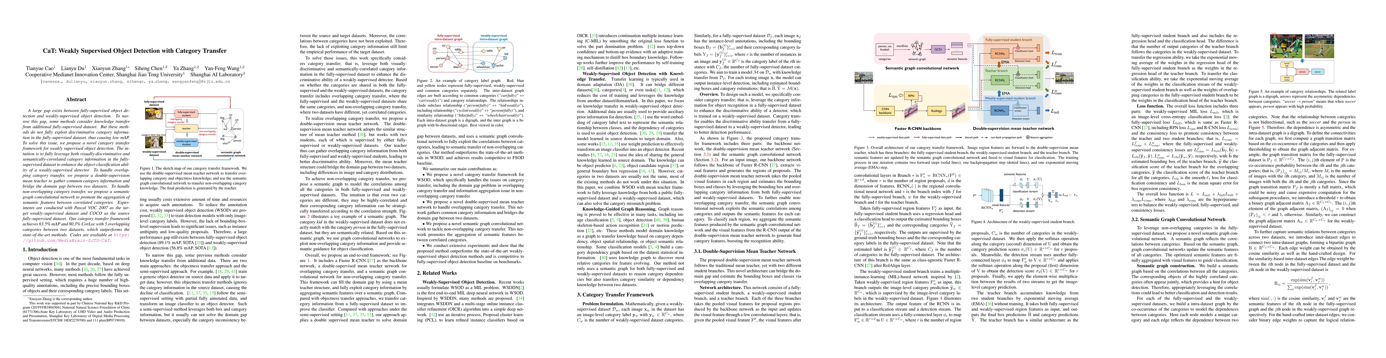 The paper proposes a novel category transfer framework for weakly-supervised object detection that leverages both visually-discriminative and semantically-correlated category information from a fully-supervised dataset to enhance detection performance. The framework uses a double-supervision mean teacher and a semantic graph convolutional network to handle overlapping and non-overlapping category transfers, achieving superior results on Pascal VOC 2007.