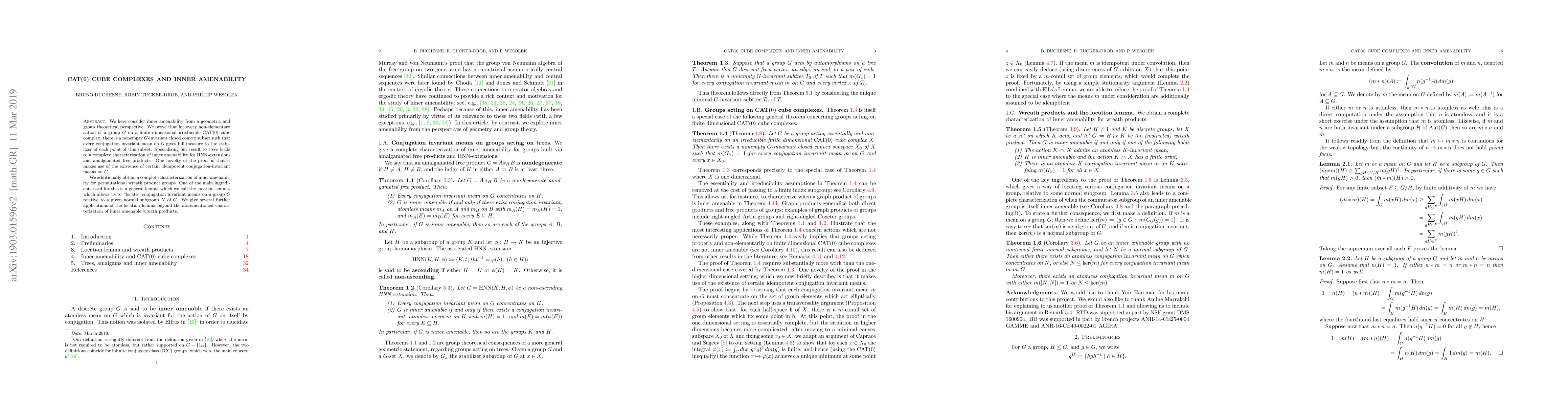We here consider inner amenability from a geometric and group theoretical perspective. We prove that for every non-elementary action of a group $G$ on a finite dimensional irreducible CAT(0) cube complex, there is a nonempty $G$-invariant closed convex subset such that every conjugation invariant mean on $G$ gives full measure to the stabilizer of each point of this subset. Specializing our result to trees leads to a complete characterization of inner amenability for HNN-extensions and amalgamated free products. One novelty of the proof is that it makes use of the existence of certain idempotent conjugation-invariant means on $G$. We additionally obtain a complete characterization of inner amenability for permutational wreath product groups. One of the main ingredients used for this is a general lemma which we call the location lemma, which allows us to "locate" conjugation invariant means on a group $G$ relative to a given normal subgroup $N$ of $G$. We give several further applications of the location lemma beyond the aforementioned characterization of inner amenable wreath products.