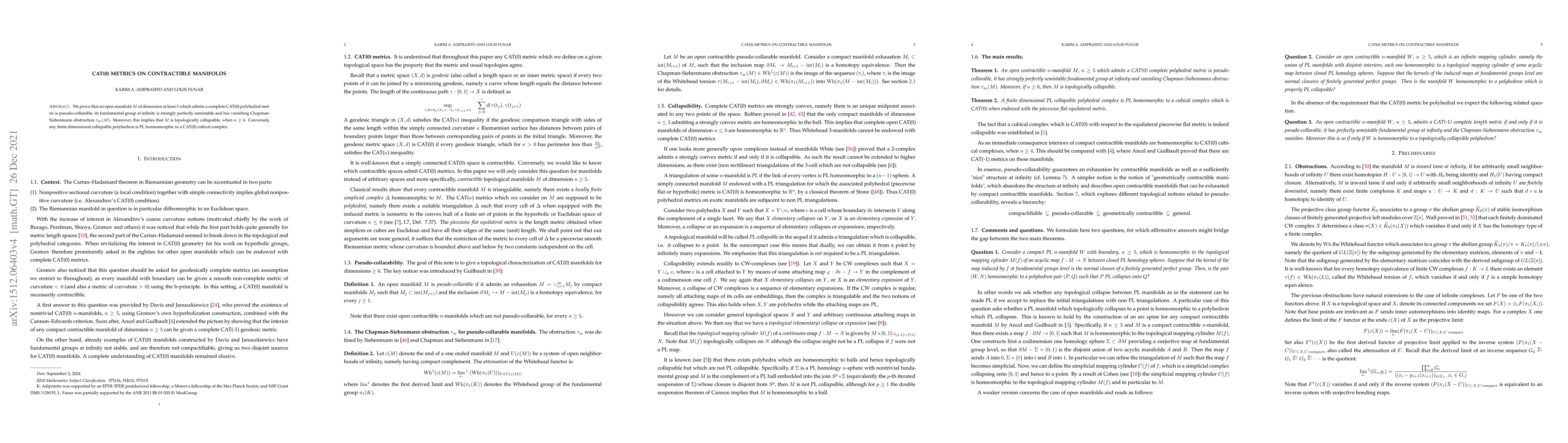 The paper proves that open manifolds of dimension at least 5 with complete CAT(0) metrics are pseudo-collarable and topologically collapsible, while their fundamental groups exhibit strong semistability. Conversely, finite-dimensional collapsible polyhedra are PL homeomorphic to CAT(0) cubical complexes.