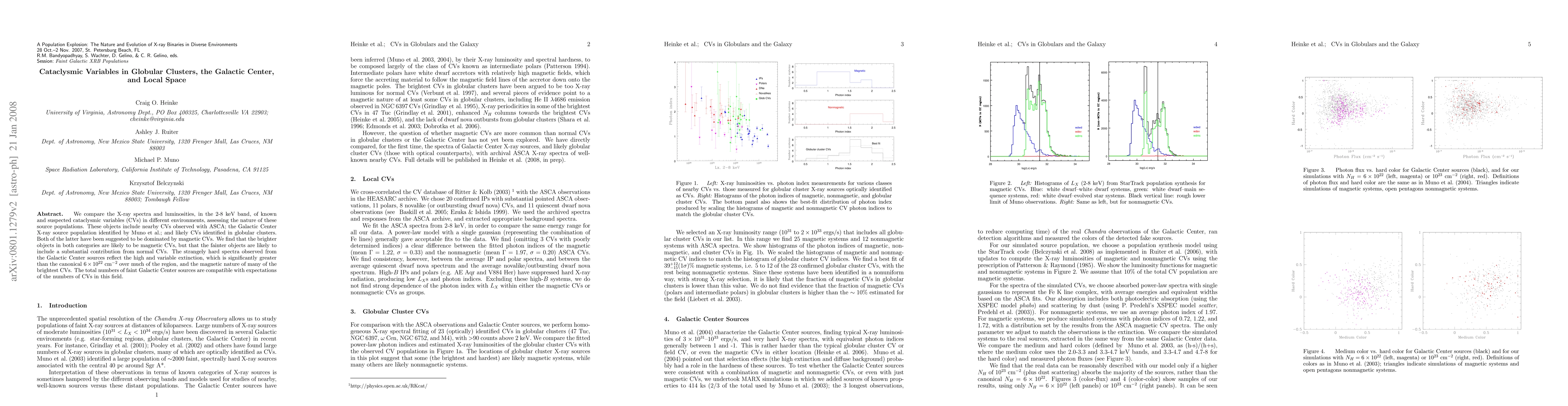 This study compares X-ray spectra and luminosities of cataclysmic variables (CVs) in globular clusters, the Galactic Center, and local space, finding that brighter objects are likely magnetic CVs, while fainter ones include normal CVs. The hard spectra of Galactic Center sources are attributed to high extinction and the magnetic nature of the brightest CVs.
