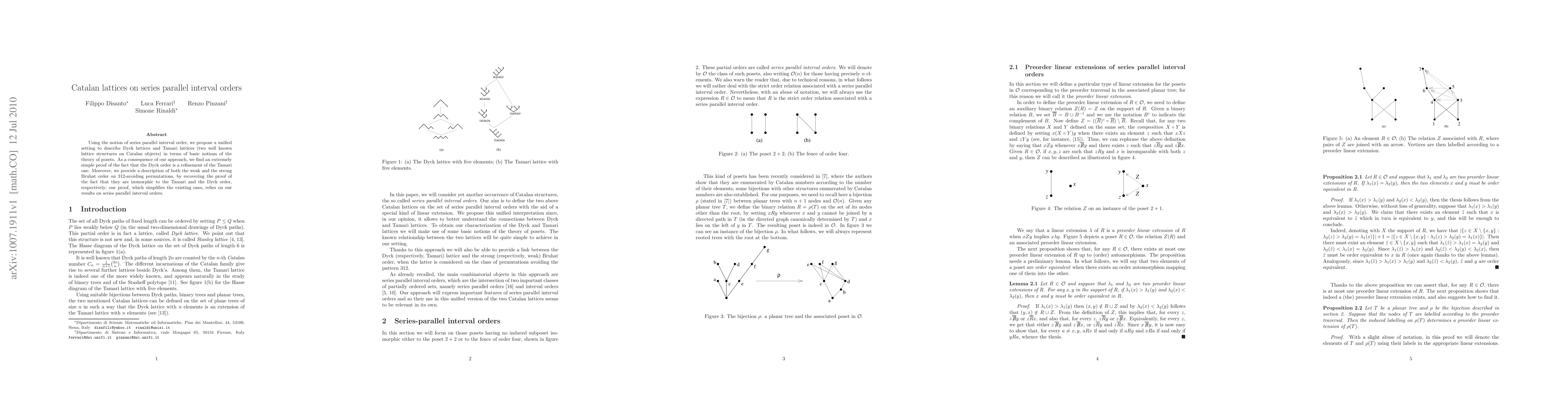 Using the notion of series parallel interval order, we propose a unified setting to describe Dyck lattices and Tamari lattices (two well known lattice structures on Catalan objects) in terms of basic notions of the theory of posets. As a consequence of our approach, we find an extremely simple proof of the fact that the Dyck order is a refinement of the Tamari one. Moreover, we provide a description of both the weak and the strong Bruhat order on 312-avoiding permutations, by recovering the proof of the fact that they are isomorphic to the Tamari and the Dyck order, respectively; our proof, which simplifies the existing ones, relies on our results on series parallel interval orders.