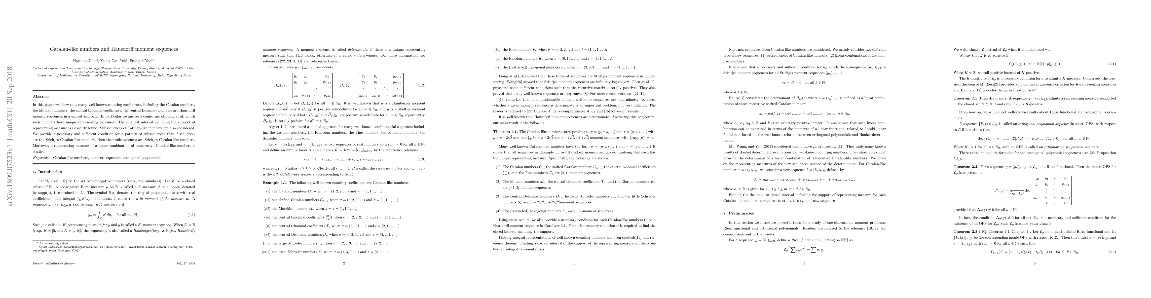 In this paper we show that many well-known counting coefficients, including the Catalan numbers, the Motzkin numbers, the central binomial coefficients, the central Delannoy numbers are Hausdorff moment sequences in a unified approach. In particular we answer a conjecture of Liang at al. which such numbers have unique representing measures. The smallest interval including the support of representing measure is explicitly found. Subsequences of Catalan-like numbers are also considered. We provide a necessary and sufficient condition for a pattern of subsequences that if sequences are the Stieltjes Catalan-like numbers, then their subsequences are Stieltjes Catalan-like numbers. Moreover, a representing measure of a linear combination of consecutive Catalan-like numbers is studied.