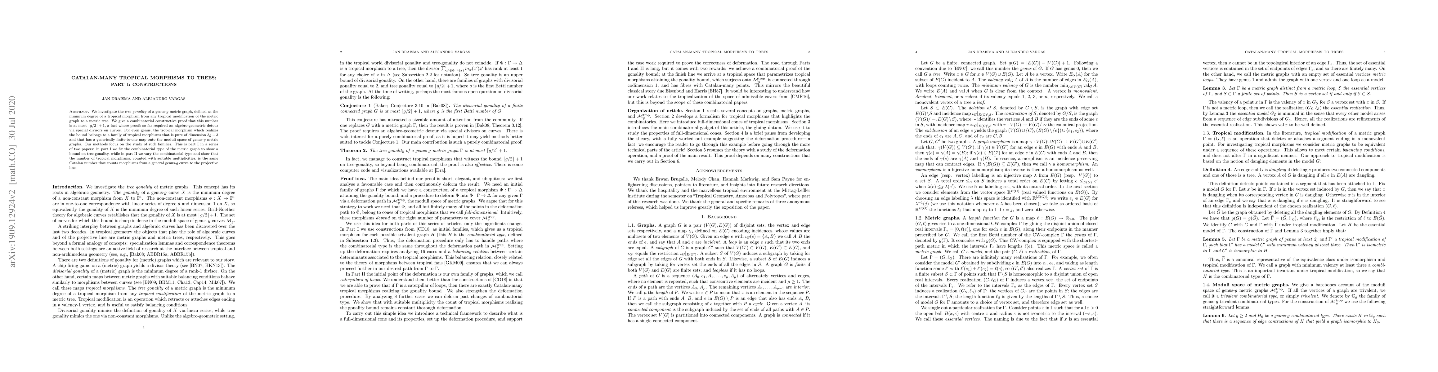 This paper constructs tropical morphisms to metric trees for genus-$g$ metric graphs, proving that the tree gonality is at most $\lceil g/2 \rceil + 1$ using combinatorial methods. It introduces a family of tropical morphisms realizing this bound for even genus. Part I focuses on fixed combinatorial types, with Part II varying these to compare counts with Catalan numbers.