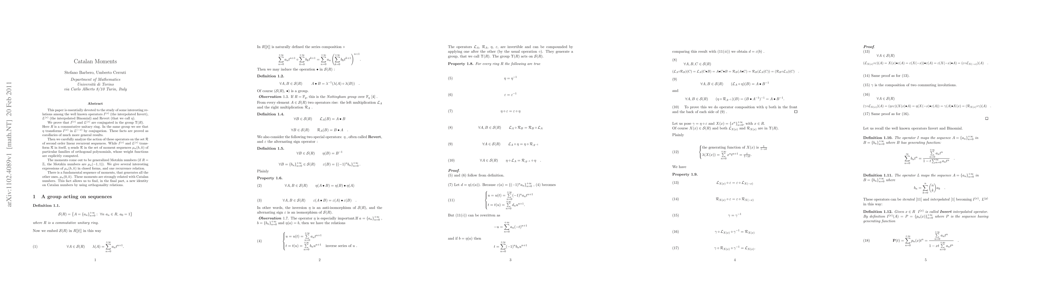 This paper is essentially devoted to the study of some interesting relations among the well known operators $I^{(x)}$ (the interpolated Invert), $L^{(x)}$ (the interpolated Binomial) and Revert (that we call $\eta$). We prove that $I^{(x)}$ and $L^{(x)}$ are conjugated in the group $\Upsilon(R)$. Here $R$ is a commutative unitary ring. In the same group we see that $\eta$ transforms $I^{(x)}$ in $L^{(-x)}$ by conjugation. These facts are proved as corollaries of much more general results. Then we carefully analyze the action of these operators on the set $\mc{R}$ of second order linear recurrent sequences. While $I^{(x)}$ and $L^{(x)}$ transform $\mc{R}$ in itself, $\eta$ sends $\mc{R}$ in the set of moment sequences $\mu_n(h,k)$ of particular families of orthogonal polynomials, whose weight functions are explicitly computed. The moments come out to be generalized Motzkin numbers (if $R=\zz$, the Motzkin numbers are $\mu_n(-1,1)$). We give several interesting expressions of $\mu_n(h,k)$ in closed forms, and one recurrence relation. There is a fundamental sequence of moments, that generates all the other ones, $\mu_n(0,k)$. These moments are strongly related with Catalan numbers. This fact allows us to find, in the final part, a new identity on Catalan numbers by using orthogonality relations.