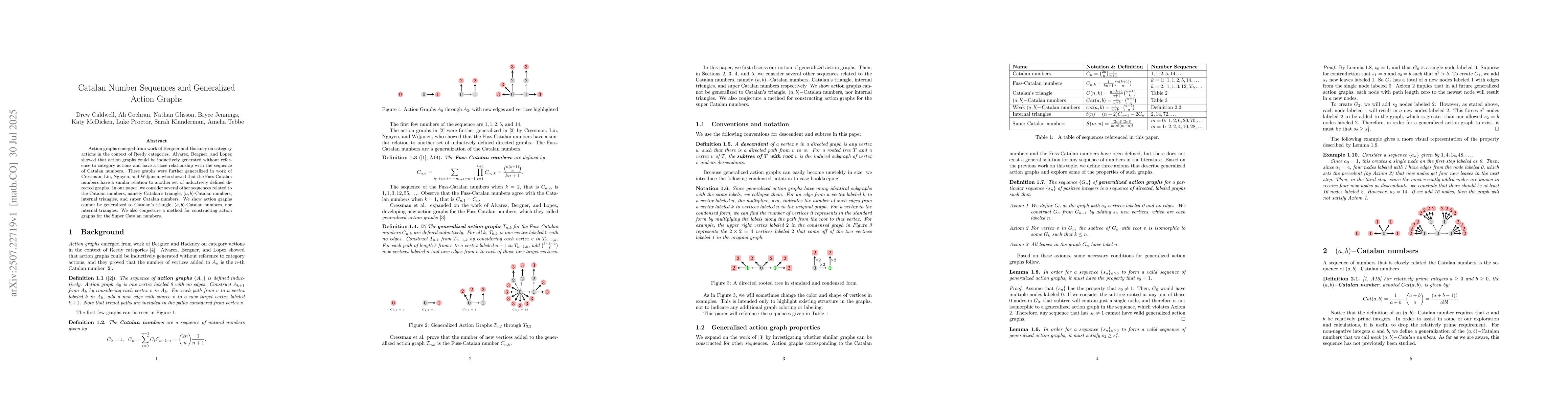 The paper explores generalized action graphs in relation to various sequences associated with Catalan numbers, including Catalan's triangle, $(a,b)$-Catalan numbers, internal triangles, and super Catalan numbers.