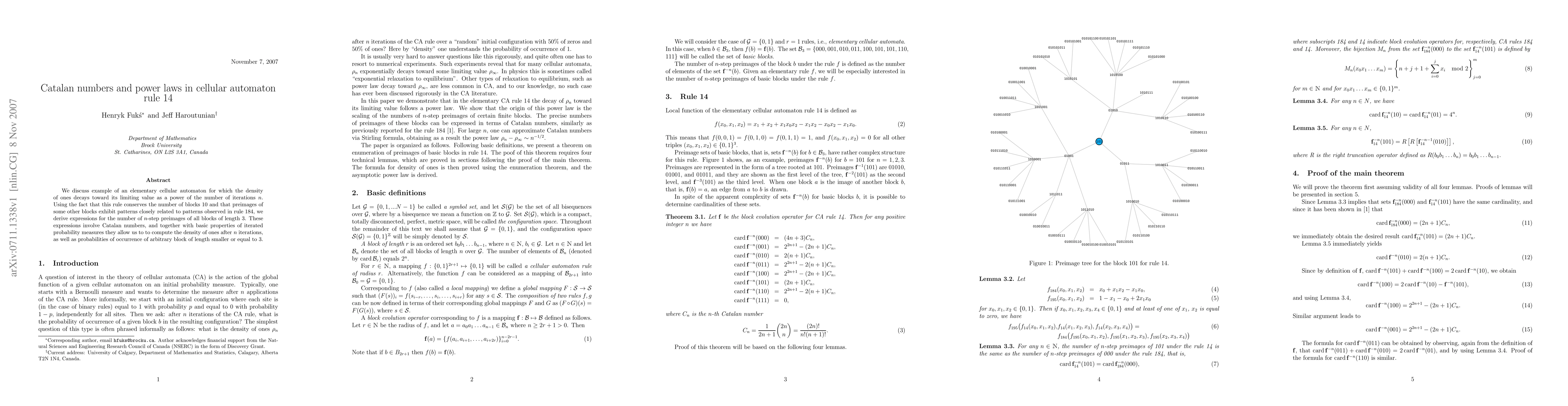 This paper explores how a specific cellular automaton rule, Rule 14, produces power-law decay in the density of ones after n iterations. It uses patterns from Rule 184 and Catalan numbers to compute probabilities of block occurrences up to length 3.