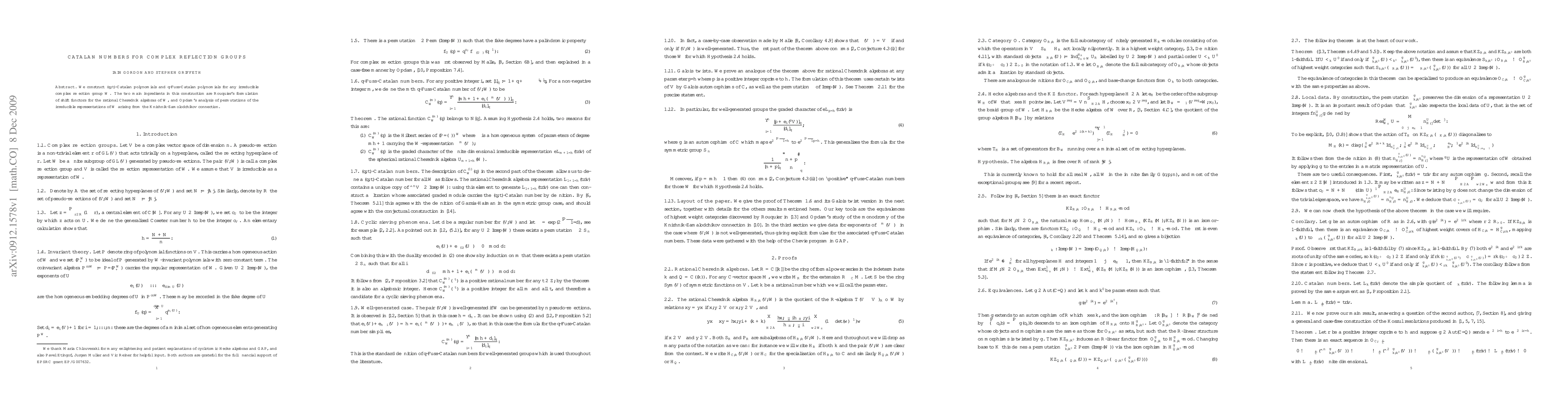This paper constructs (q,t)-Catalan and q-Fuss-Catalan polynomials for irreducible complex reflection groups W using Rouquier's shift functors and Opdam's representation analysis, linking algebraic structures and combinatorial identities.