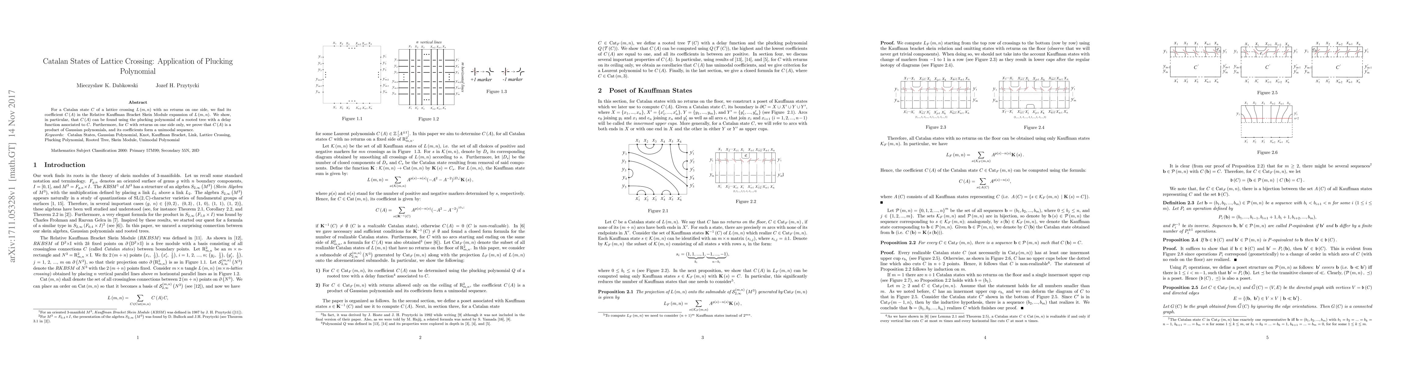 This paper investigates the coefficient $C(A)$ of a Catalan state $C$ in the Relative Kauffman Bracket Skein Module expansion for a lattice crossing $L(m,n)$. It demonstrates that $C(A)$ can be determined using the plucking polynomial of a rooted tree linked to a delay function associated with $C$. Additionally, for Catalan states with returns on one side, it proves that $C(A)$ is a product of Gaussian polynomials with unimodal coefficients.