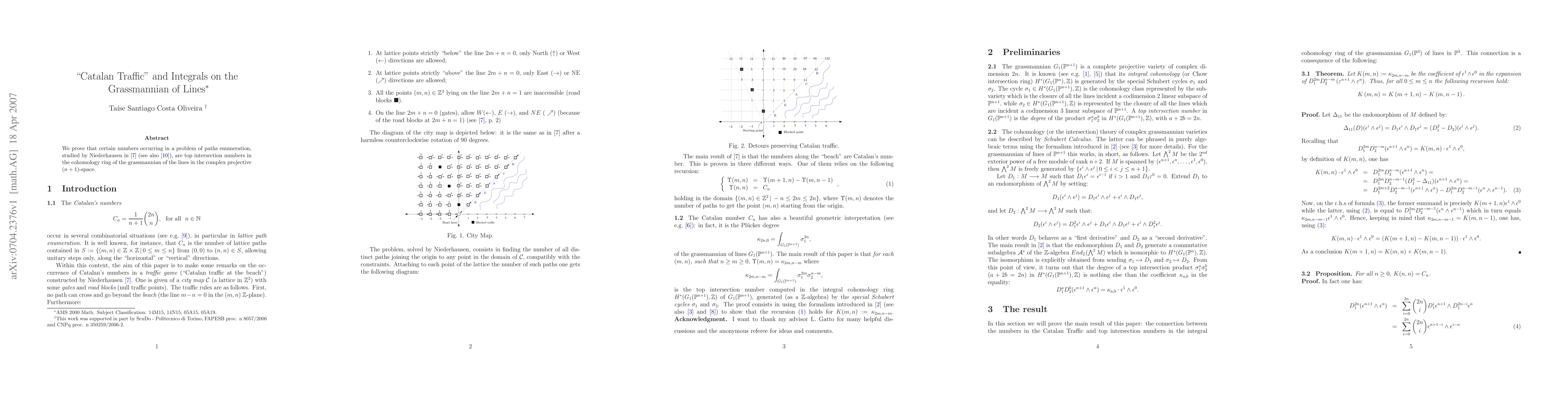 We prove that certain numbers occurring in a problem of paths enumeration, studied by Niederhausen (Catlan Traffic at the Beach, The Electronic Journal of Combinatorics, 9, (2002), 1--17), are top intersection numbers in the cohomology ring of the grassmannians of the lines in the complex projective (n+1)-space.